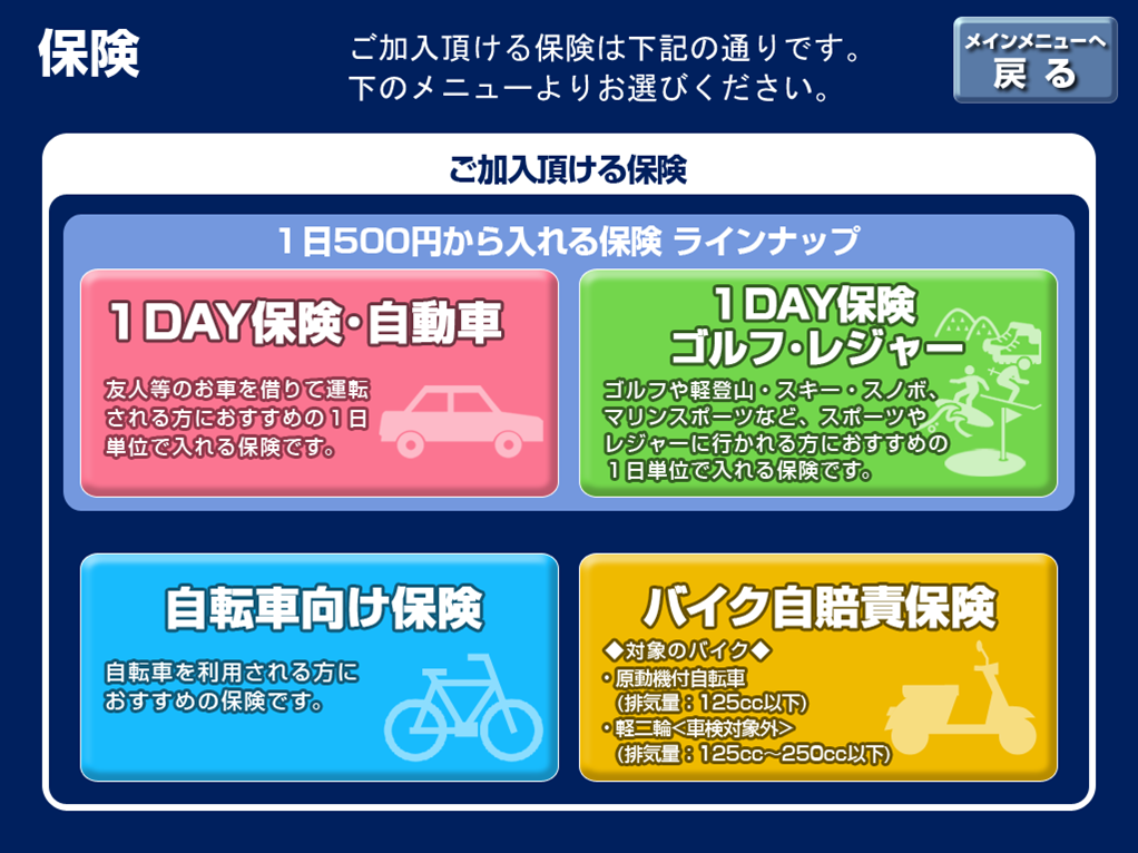 ◆店舗にて、契約の申込手続から保険料支払いまで完結できます。 ◆「1DAY保険」(1日単位の自動車保険)にもスムーズに加入できます。 ➢「1DAYレジャー保険」で入力した項目をそのまま引き継ぎ、「1DAY保険」に加入することができるため、入力の手間を省き、スムーズな手続が可能です。 |