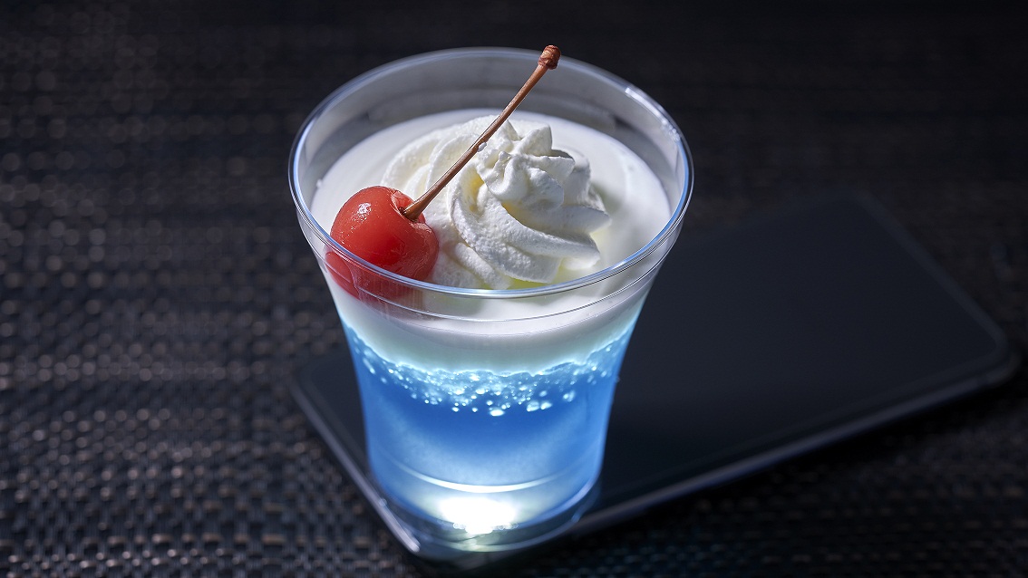 ◆「ブルーハワイのフロート」を再現した、鮮やかで涼しげな見た目が特長。ソーダ味のゼリーとレモンムースの上に、ホイップクリームとさくらんぼをトッピング。