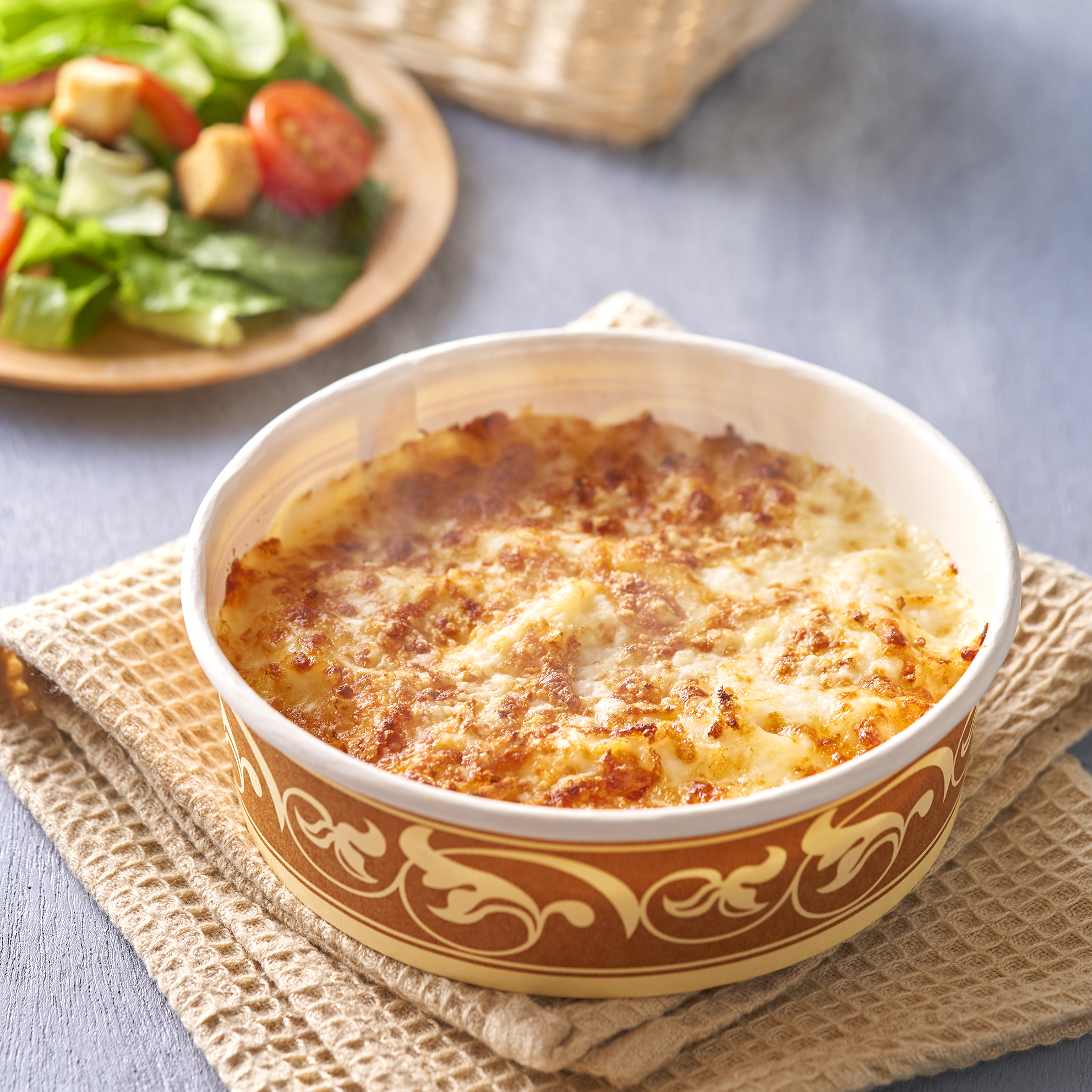 グラタンのあるべき製法を採用し、茹で上げたペンネとホワイトソースを和え、上にパルメジャーノ・レッジャーノやチェダー等5種のチーズをトッピングし、チーズがこんがりするまで、オーブンでしっかりと焼き上げます。その後、急速冷凍することでおいしさを閉じ込めました。電子レンジで温めると、その場で調理したような、香りの良いグラタンがお楽しみいただけます。