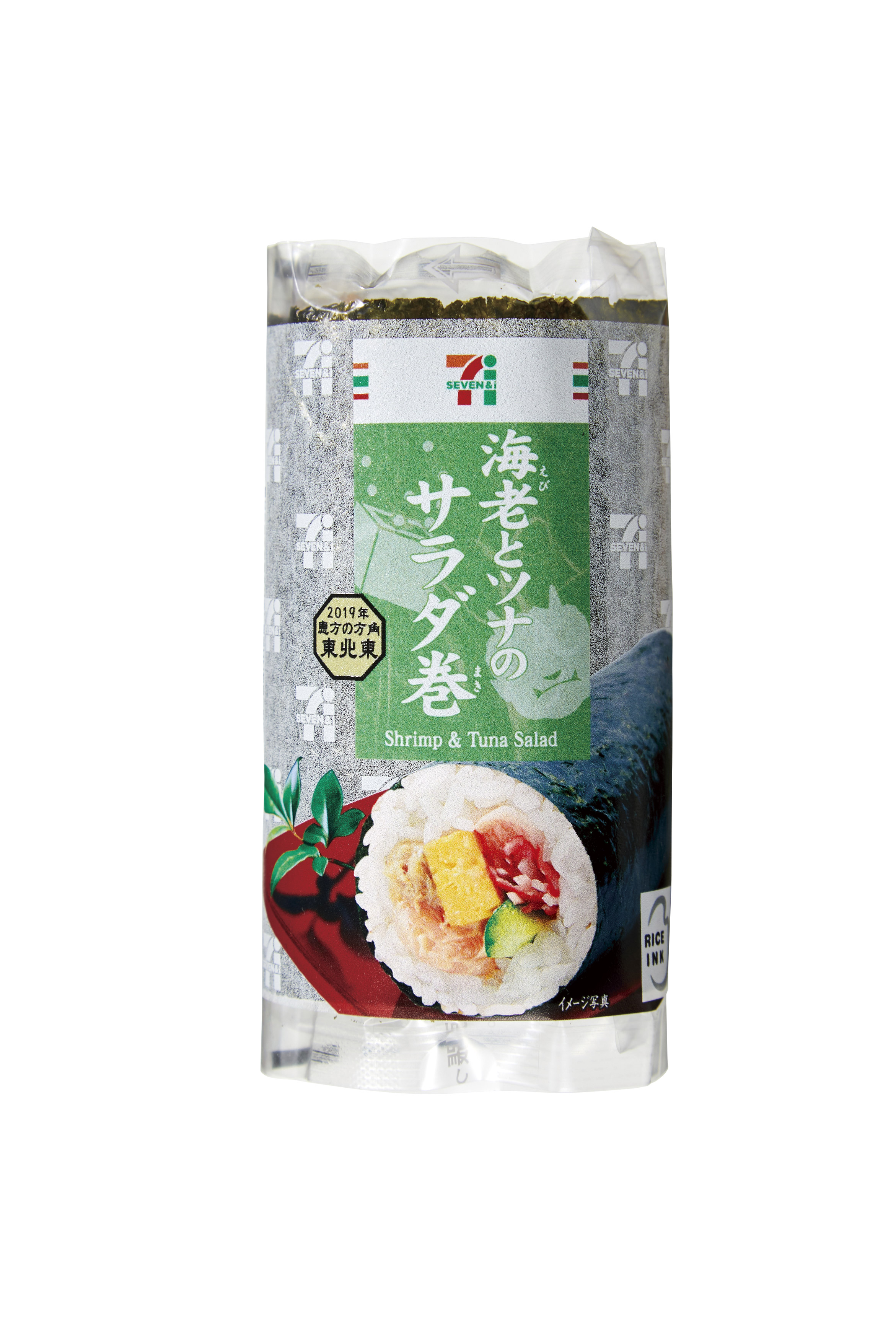 【商品特長】:海老、ツナなどの人気具材に、こだわり卵「ななたま」を使用した専用マヨネーズでコクのある味わいのサラダ巻。