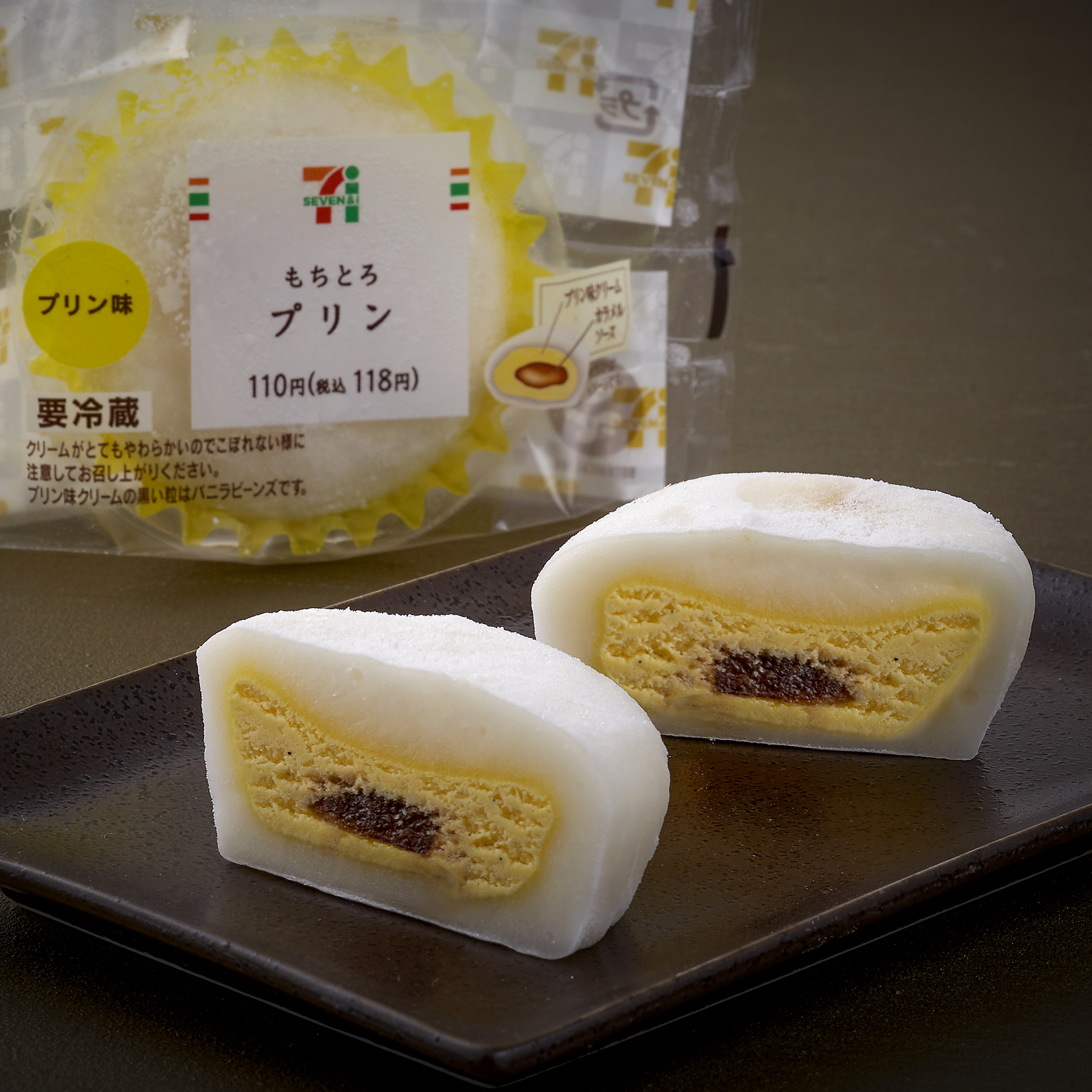 ・とろけるような食感のもち生地で、プリン味のクリームとほろ苦いカラメルソースを包んだ、口どけの良いなめらかな舌触りが楽しめる仕立て。