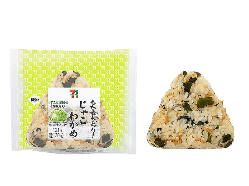 セブン‐イレブンは、2018年3月より「カラダへの想いこの手から」のロゴマークを商品に貼付し、「安全・安心・健康」にこだわった商品の展開を強化しております。『もち麦もっちり!じゃこわかめおむすび』は、もち麦を使用することにより、レタス約1個分の食物繊維を摂取できる商品です。