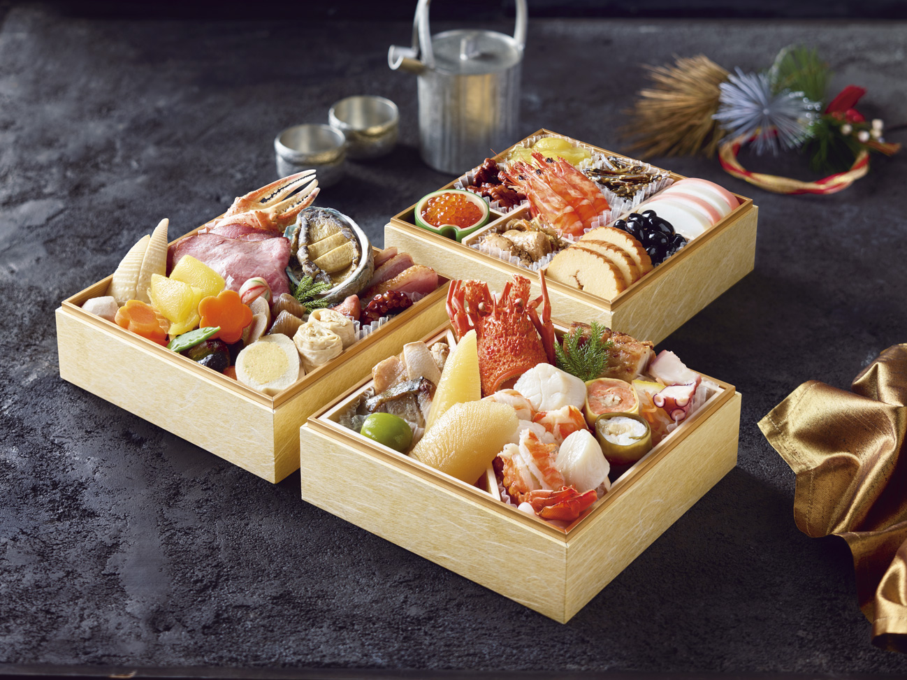 【具材】         :丹波篠山産黒豆、三陸産いくら醤油漬け、鹿児島県産黒豚の角煮、数の子、鹿児島県産ブリの照り焼き、有頭海老の艶煮