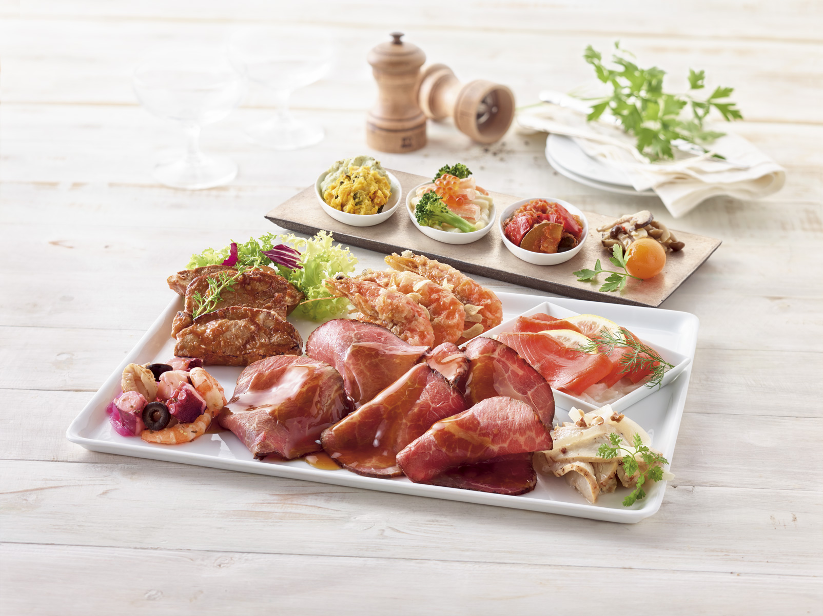 【商品特長】 :ローストビーフやスモークサーモンなどの人気メニューを贅沢に揃えた洋風オードブル。