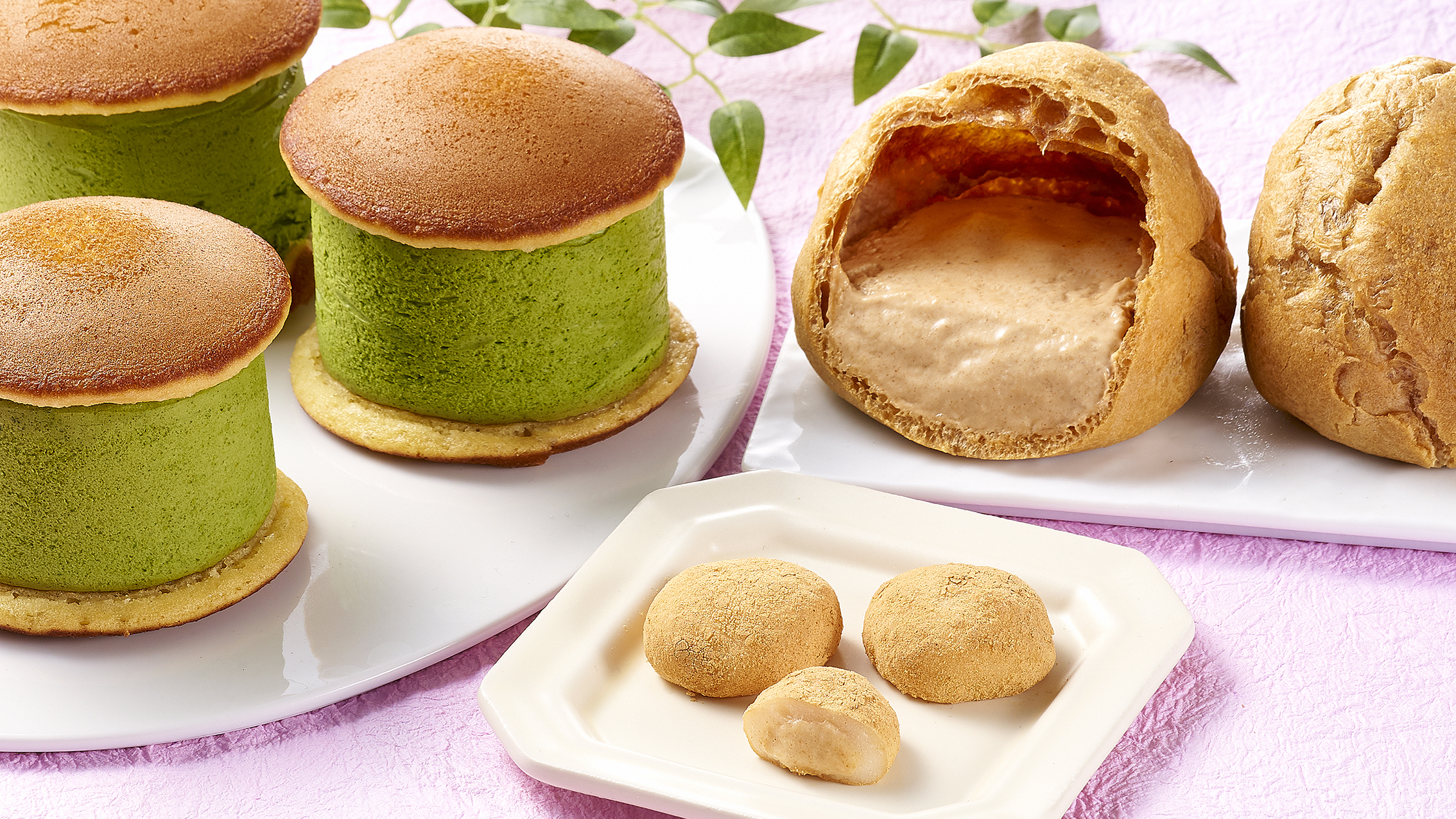 『京風きなこもこ』や『京風きなこクリームもち3個入り』等には、“京風きなこ”を使用。じっくりと焙煎し香ばしい香りが引き立つ味わいが特長の“京風きなこ”を、今回はホイップクリームと合わせたり、餅の周りにもまぶして使用したりと風味豊かなスイーツをお楽しみいただけます。『たっぷり抹茶クリーム生どら焼』は、風味高い“宇治抹茶”を使用した和洋折衷スイーツに仕立てました。