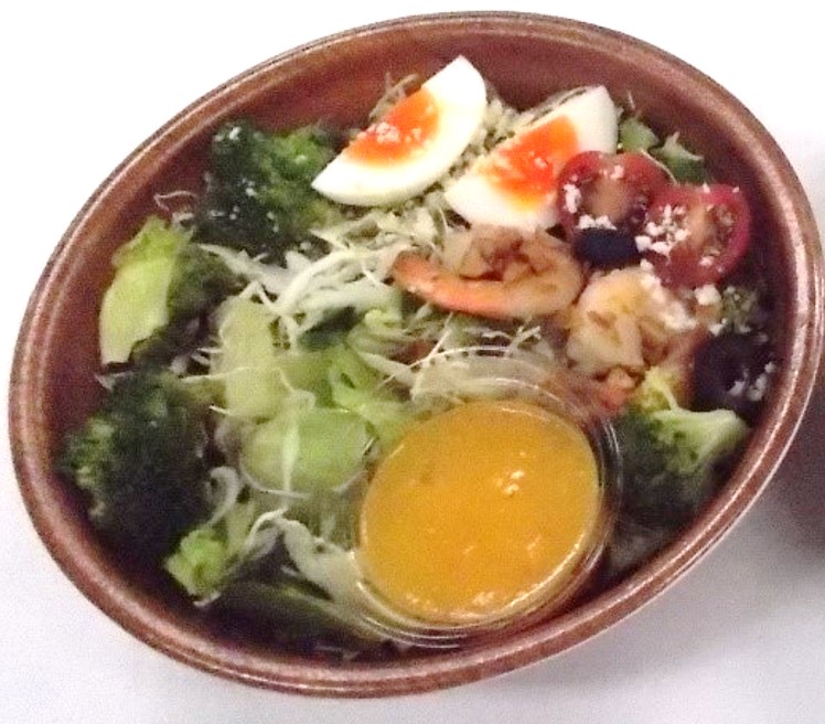 〇彩りのよい具材(海老・たまご・トマト・ブロッコリー・オリーブ・アーモンドスライス)で華やかな仕立て。