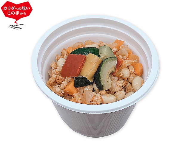 ☞大豆ミートのそぼろと、大豆、もち麦が入ったスープ。野菜の旨味がしっかりと感じられるトマトスープです。