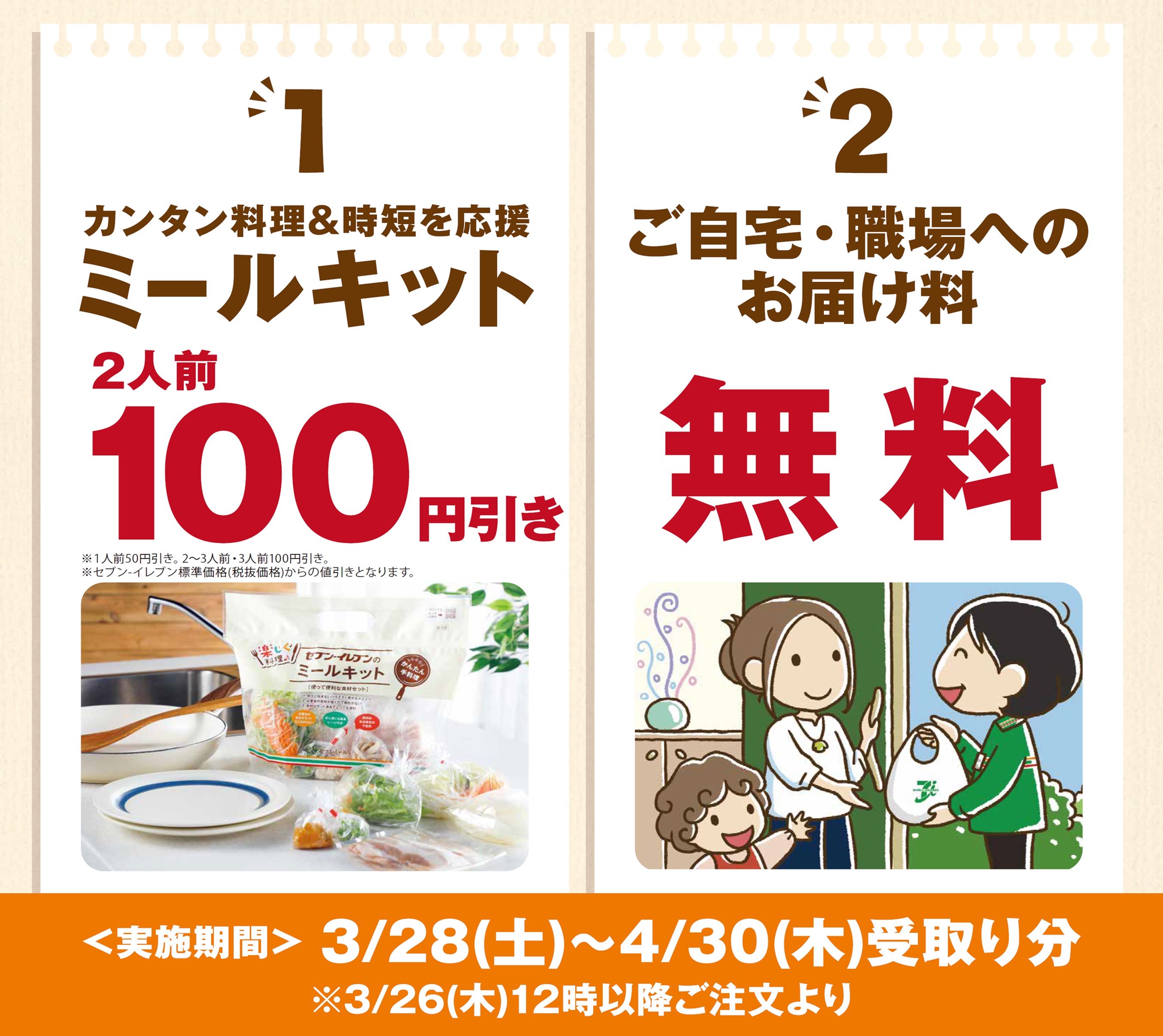 株式会社セブン‐イレブン・ジャパン(本社:東京都千代田区、代表取締役社長:永松 文彦)は、セブン‐イレブンのお届けサービス「セブンミール」で取り扱う『ミールキット』の割引キャンペーン及び配送料無料キャンペーンを、全国のセブン‐イレブン20,955店※1(2020年2月末現在)にて、3月28日(土)からのお店受取り及び指定先お届け分より実施いたします。