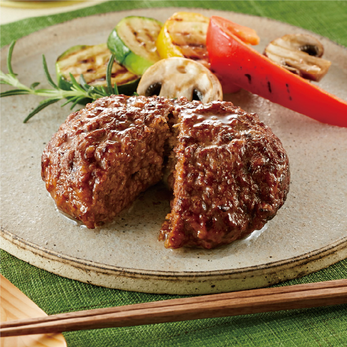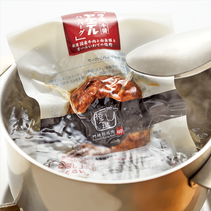 ■商品特長:岩手県一関市を拠点に、門崎熟成肉の魅力を 発信する「格之進」。ミートレストラン「格之進」でも人気のハンバーグを、本年より湯せん可能とする ことで、おいしく簡単調理できるセット。