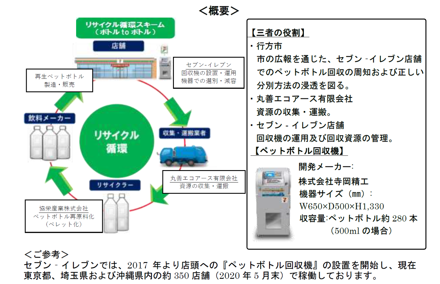 株式会社セブン‐イレブン・ジャパン(東京都千代田区、代表取締役社長:永松 文彦)は、限りある資源の有効な活用とプラスチック対策を目的としたペットボトル回収事業を実施するため、茨城県行方市と『ペットボトルの資源循環に係る協定』を締結いたします。行方市内のセブン‐イレブン全店(5月末現在:9店舗)に「ペットボトル回収機」を新たに設置し、ボトルtoボトル*1によるリサイクルを促進してまいります。