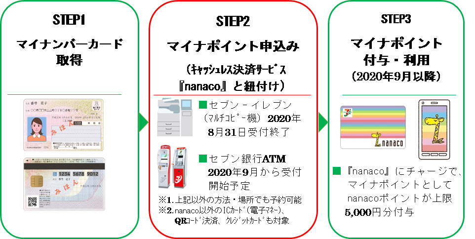 7月1日(水)より、全国のセブン‐イレブン店舗(2020年5月末現在20,930店舗)に設置されている「マルチコピー機」で、マイナポイントの申し込みが可能となります。9月からは、全国の「セブン銀行ATM」で申し込み可能となる予定です 。申し込み時に、ポイント付与を希望する決済サービスとして『nanaco※2』を選択し、9月1日以降、「セブン銀行ATM」や店頭レジ等で『nanaco』にチャージを行うと、チャージ金額の25%分(上限5,000円分)の『nanaco』ポイントが付与されます。7月以降、マイナポイント申し込みに際して『nanaco』を活用した各種キャンペーン等も、今後予定してまいります。