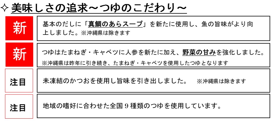 ・調味液には、従来のかつお節・昆布の旨味に加え、新たに白身魚の旨味を追加しました。