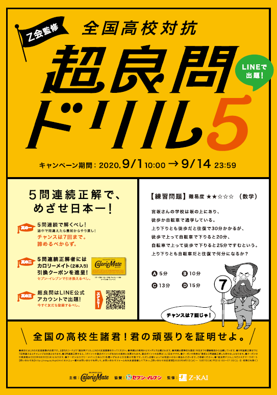 (3)出題 超良問ドリルLINEアカウント:http://nav.cx/AqkS4n1(9月1日10時公開)に標準的な高校1年生までの主要5教科の履修範囲から、ランダムに出題します。東大・京大をはじめとする難関大学の受験に高い実績を誇るZ会の専門スタッフが監修し、知識だけでなく「考える力」を駆使しなければ正解にたどり着けない「超良問」を出題しております。