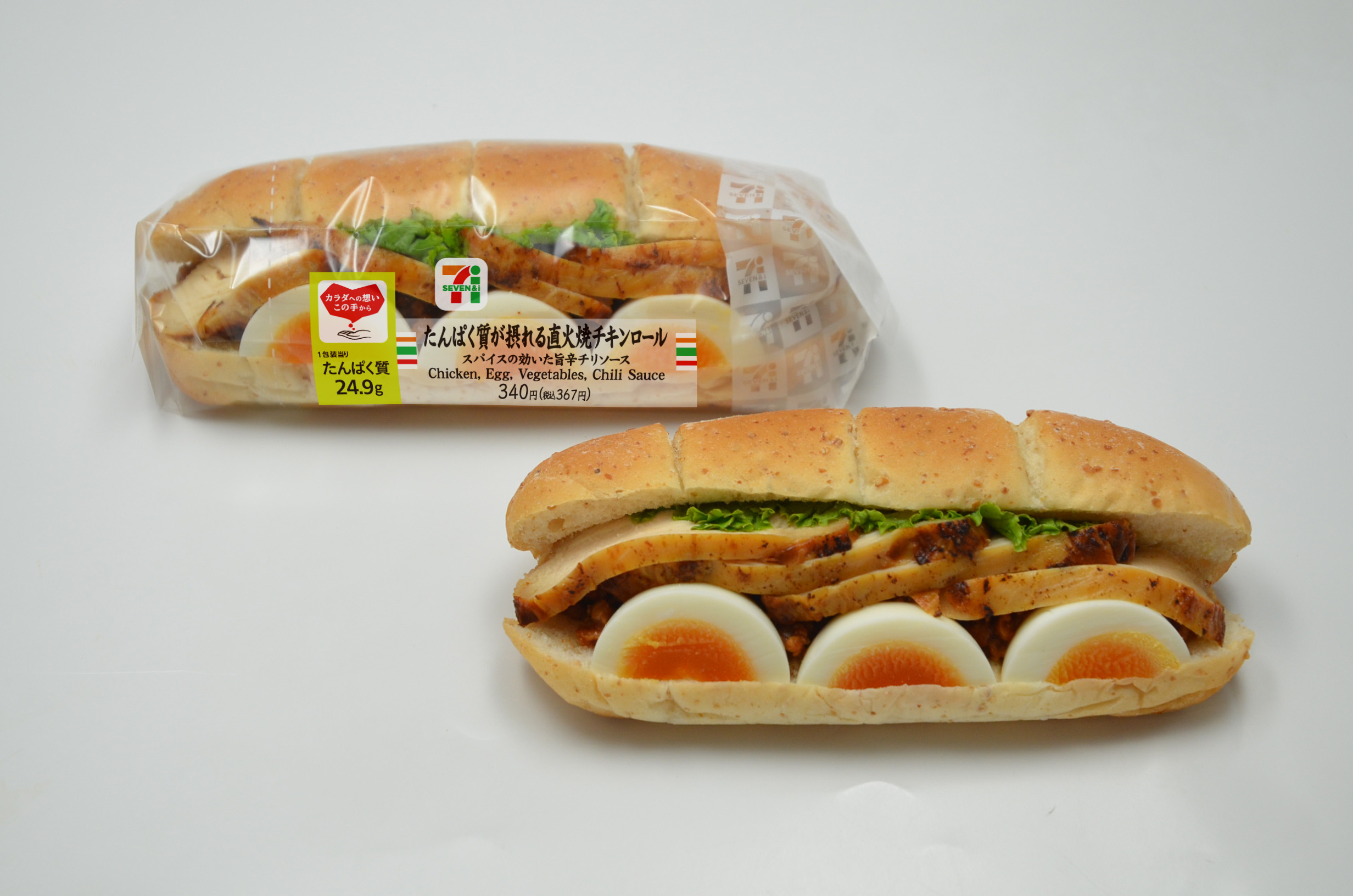 ・ローストチキン、ゆでたまごを彩りよく盛り付け、チリソースを盛り付け、1包装あたり約24gのたんぱく質が摂れます。
