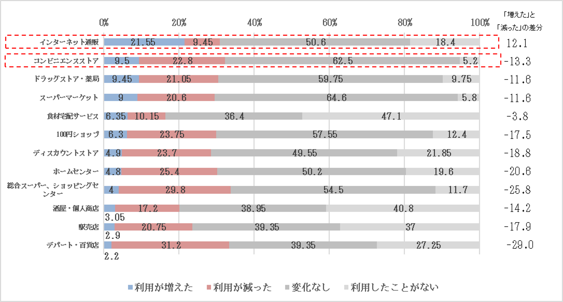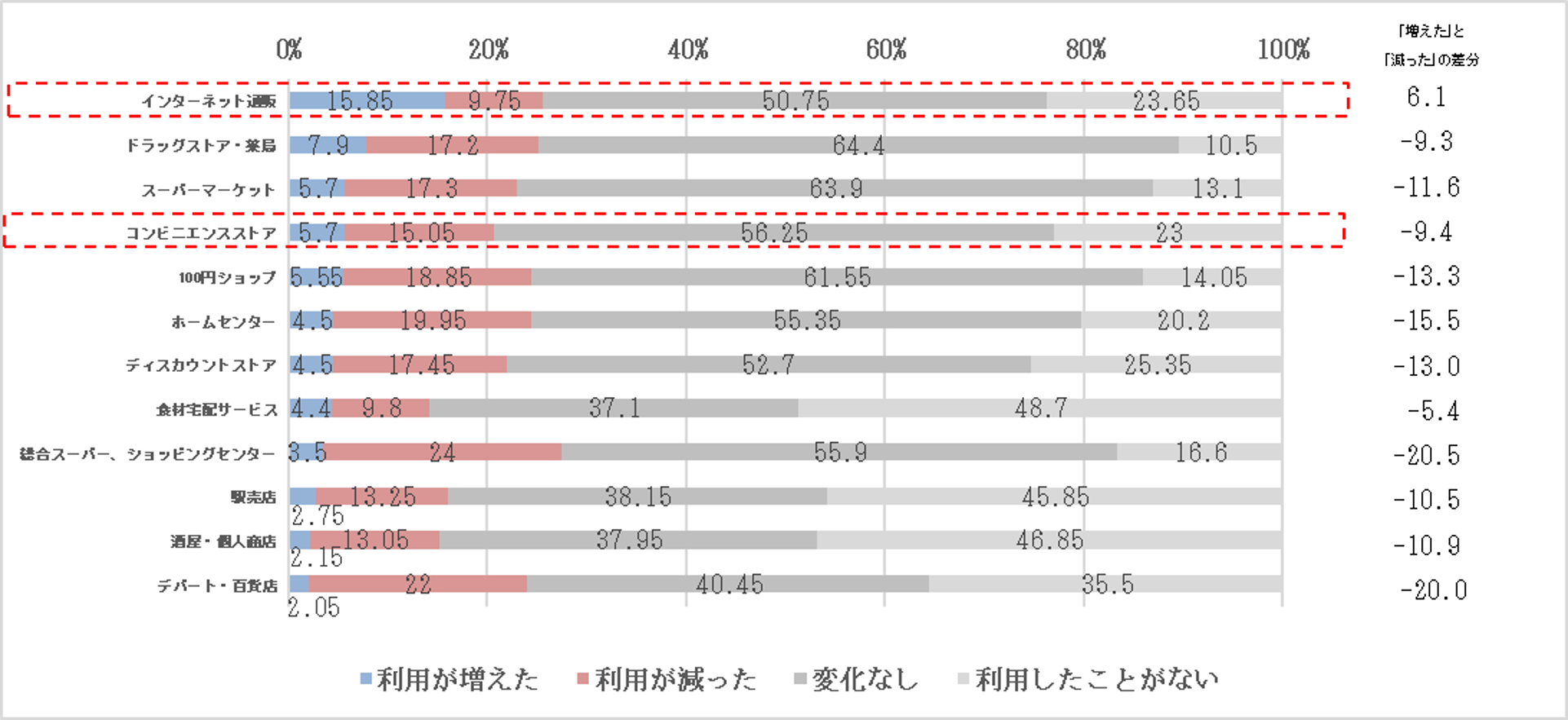 ■日用品の購入における、各店舗の利用頻度の変化(2019年以前と2020年5月下旬以降の比較)