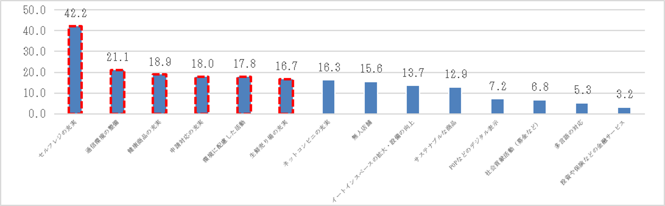 今後のコンビニエンスストアに求めるものについて聞きました。「セルフレジの充実(42.2%)」「通信環境の整備(21.1%)」「健康商品の充実(18.9%)」「申請対応の充実(18.0%)」「環境に配慮した活動(17.8%)」と続きました。これからのコンビニエンスストアに求めるものとして、①買い物体験をより快適にする機能(セルフレジ、wi‐fi等)、②人間や環境に配慮したエシカルな取り組み、③生活サポートサービスの拡張(各種証明書の発行等)の要素が求められるようになっていることが分かりました。