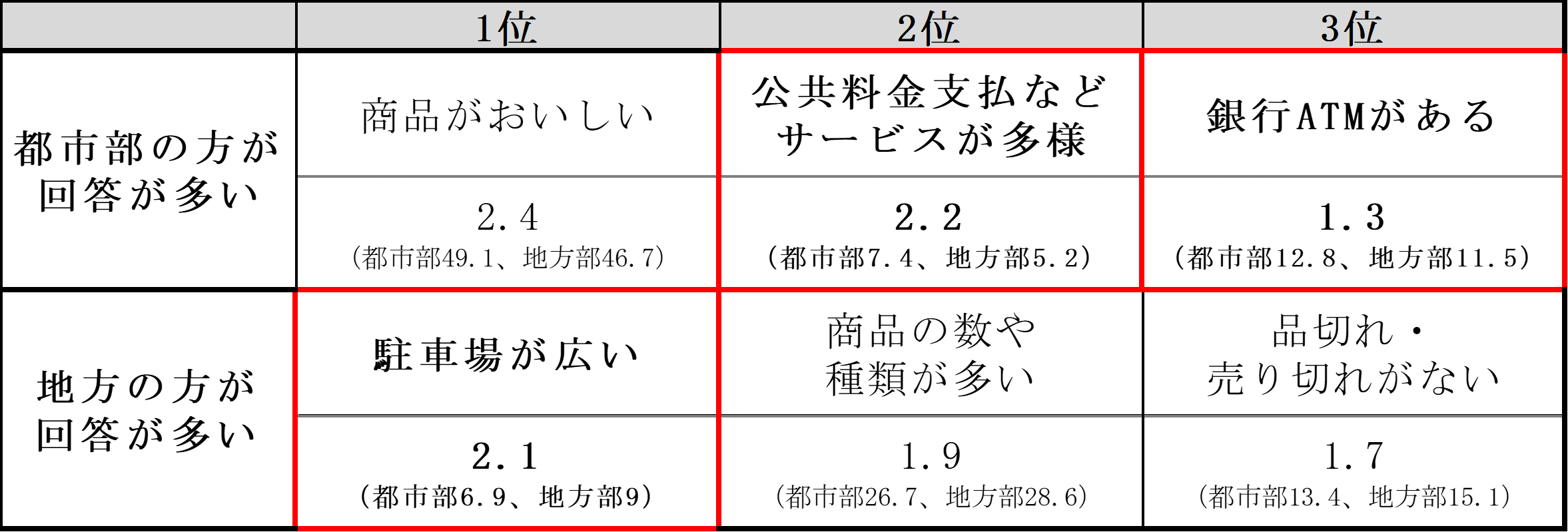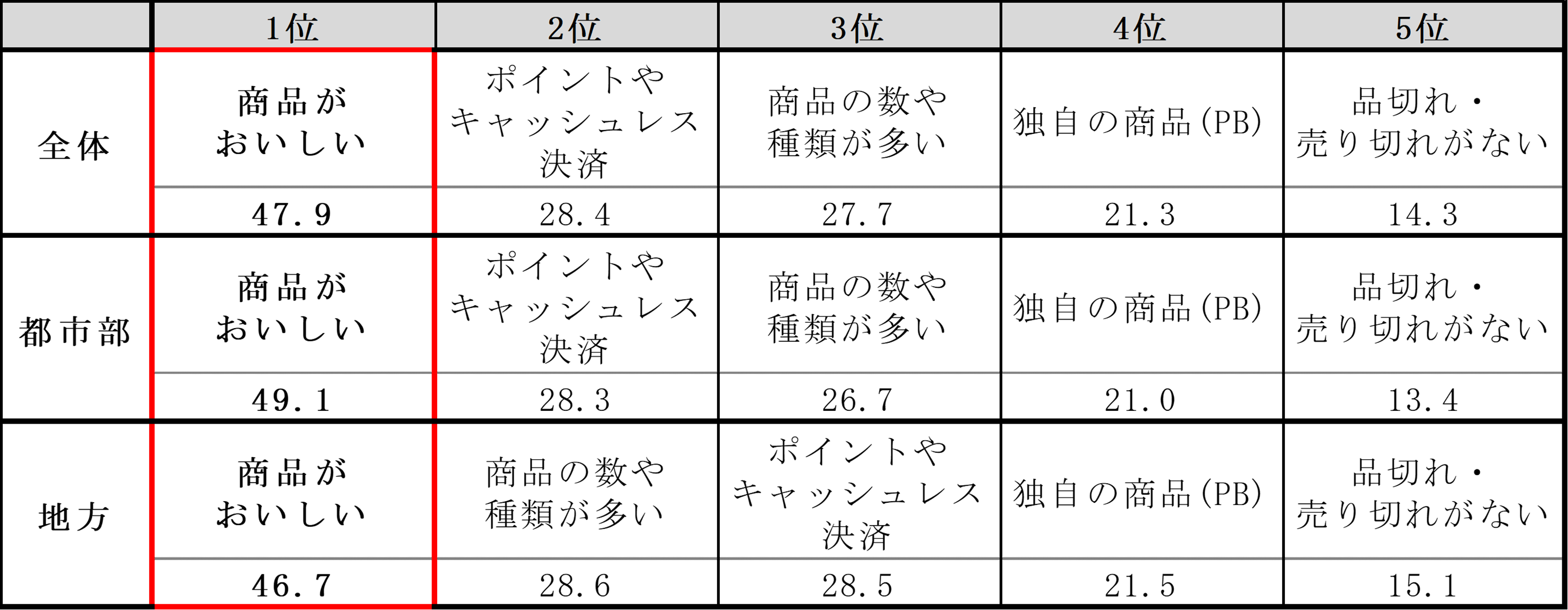 最も行きたいコンビニエンスストアの理由(距離除く)について聞きました。「商品がおいしい(47.9%)」が最も多く、続いて「ポイントカードやキャッシュレスに対応している(28.4%)」「商品の数や種類が多い(27.7%)」が上位となりました。コンビニエンスストアの商品や利便性に関する項目が上位に挙げられました。さらに都市部と地方での回答の差をみると都市部は公共料金などコンビニエンスストアの機能やサービス面を重視する傾向があり、地方は、駐車場の広さを重視する回答が多く、買い物やアクティビティなど、車での外出とセットでコンビニを利用する回遊性の良さを重視する傾向が見られました。