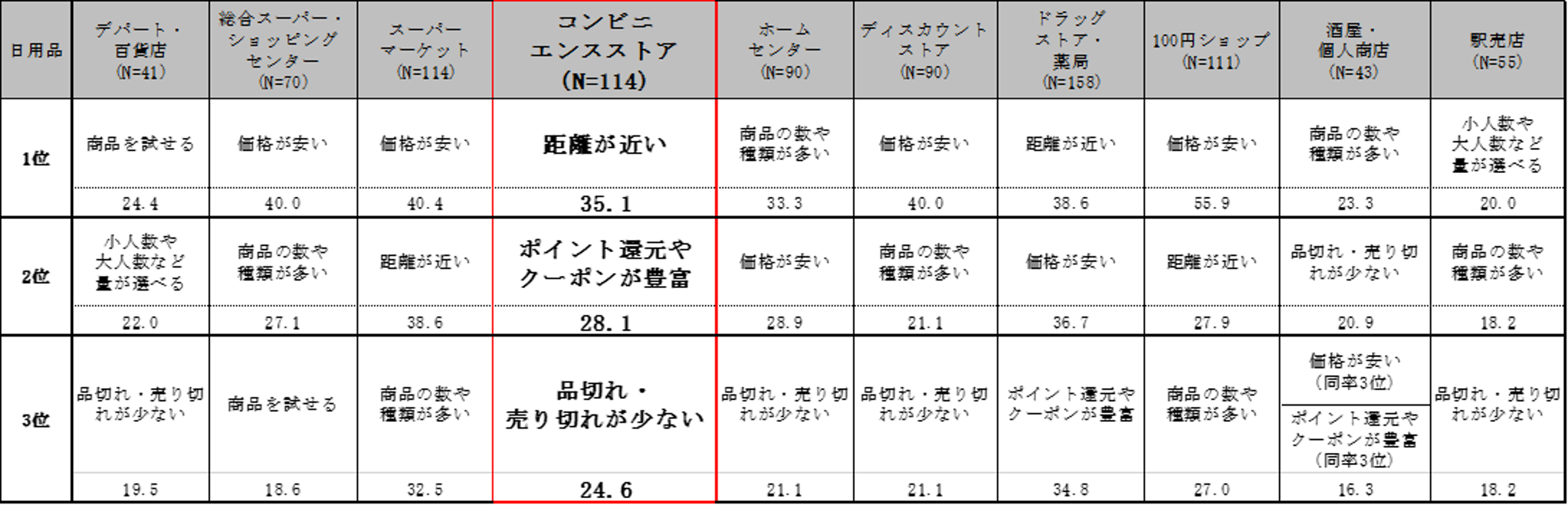 ■日用品の購入における、各実店舗の利用が増えた理由 TOP3(数値は%、複数回答)