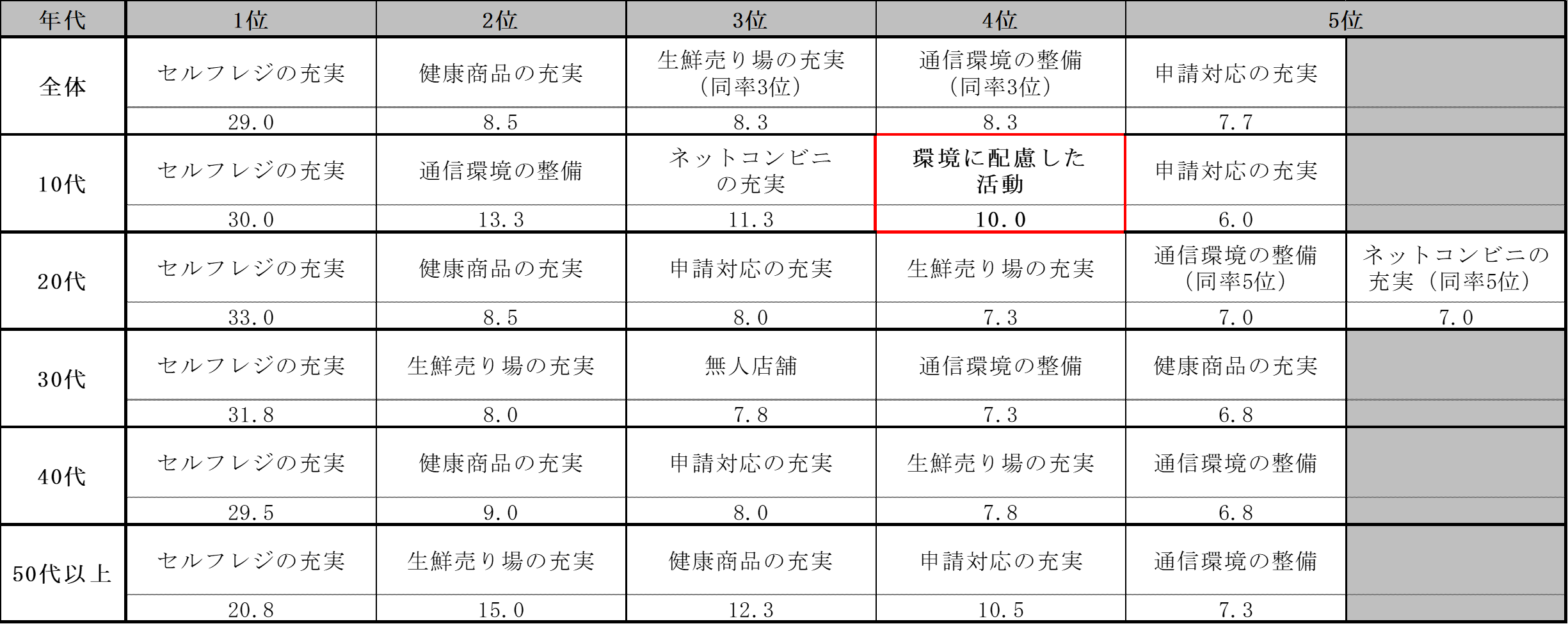また、今後のコンビニエンスストアに最も求めることは、「セルフレジの充実(29.0%)」「健康商品の充実(8.5%)」「生鮮売り場の充実(8.3%)」と続きました。年代別でみると、10代のみTOP5に「環境に配慮した活動」がランクインしており、10代の環境問題への関心の高さが伺えます。また50代以上は「生鮮売り場の充実」の数値が高く、生活の拠点としての役割を求めている傾向が見られました。