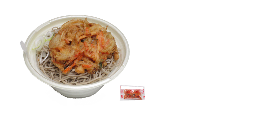 ・かき揚げは、玉ねぎや人参、ごぼう等の野菜を、小エビの粉末を合わせた衣で揚げており、つゆと馴染むことでさらにコクのある旨みを感じられる味わい。