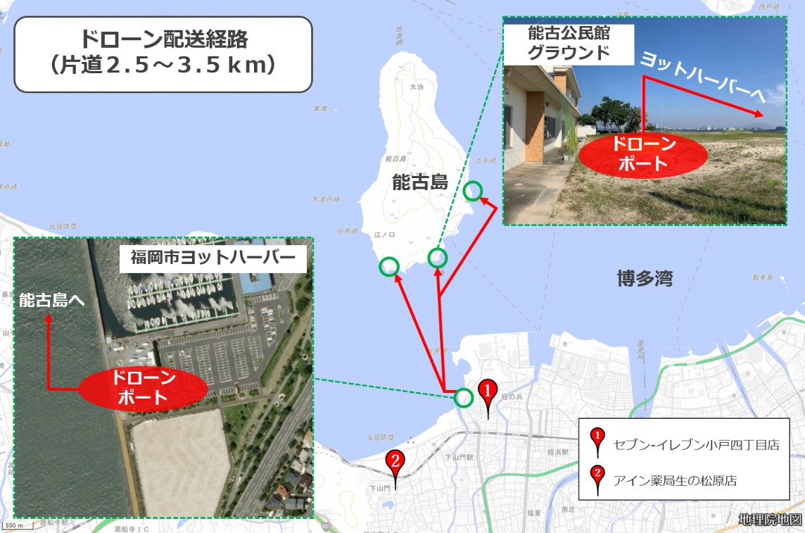 ANAホールディングス株式会社(本社:東京都港区、代表取締役社長:片野坂 真哉、以下「ANAHD」)、株式会社アインホールディングス(本社:北海道札幌市、代表取締役社長:大谷 喜一)、株式会社セブン-イレブン・ジャパン(本社:東京都千代田区、代表取締役社長:永松 文彦)、福岡市は、株式会社自律制御システム研究所(本社:東京都江戸川区、代表取締役社長 兼 COO:鷲谷 聡之)、株式会社NTTドコモ(本社:東京都千代田区、代表取締役社長:吉澤 和弘)とともに、「セブン‐イレブンネットコンビニ」で注文された商品およびアイン薬局の処方箋医薬品を、福岡市ヨットハーバーから、福岡市西区能古島の島内3地点にドローンで即時配送する実証を行います。