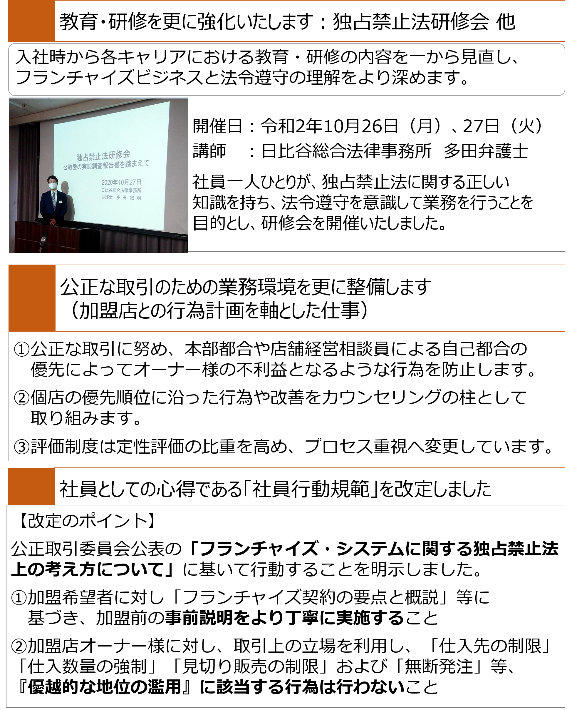 ・公正取引委員会公表の「フランチャイズ・システムに関する独占禁止法上の考え方について」を踏まえた社員行動規範の改定とその周知・教育