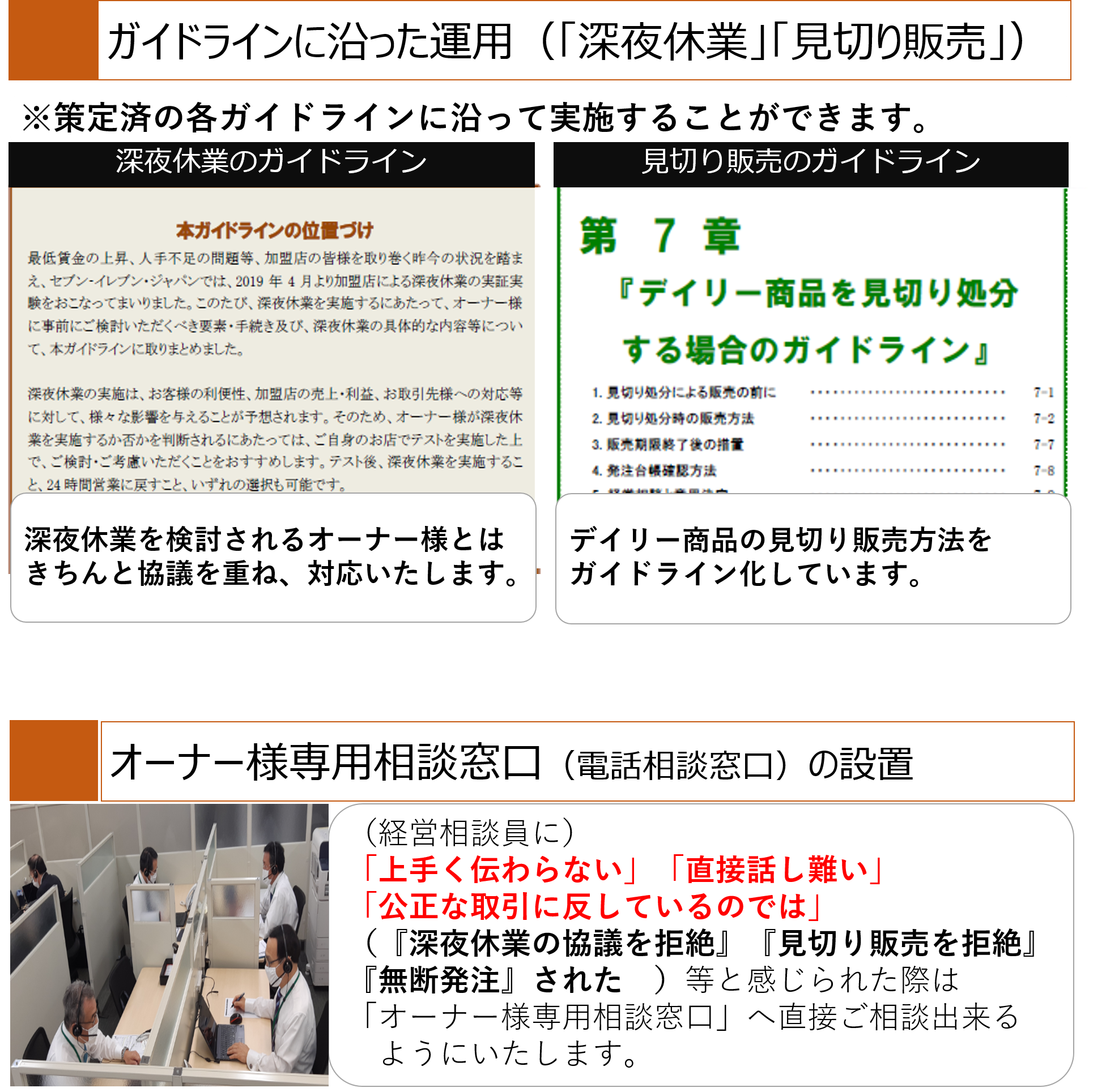 上記2の対策にかかわらず、万が一、弊社社員による不適切な言動等(深夜休業の申出の不当拒絶や無断発注等)があった場合に、加盟店オーナー様が安心して相談できるよう、セーフティネットとしての位置付けとなる「オーナー様専用相談窓口(電話相談窓口)」を設置いたします。また、この制度が適切に運用されることにより、弊社による不適切事例の迅速かつ適切な情報取得が可能になると考えております。