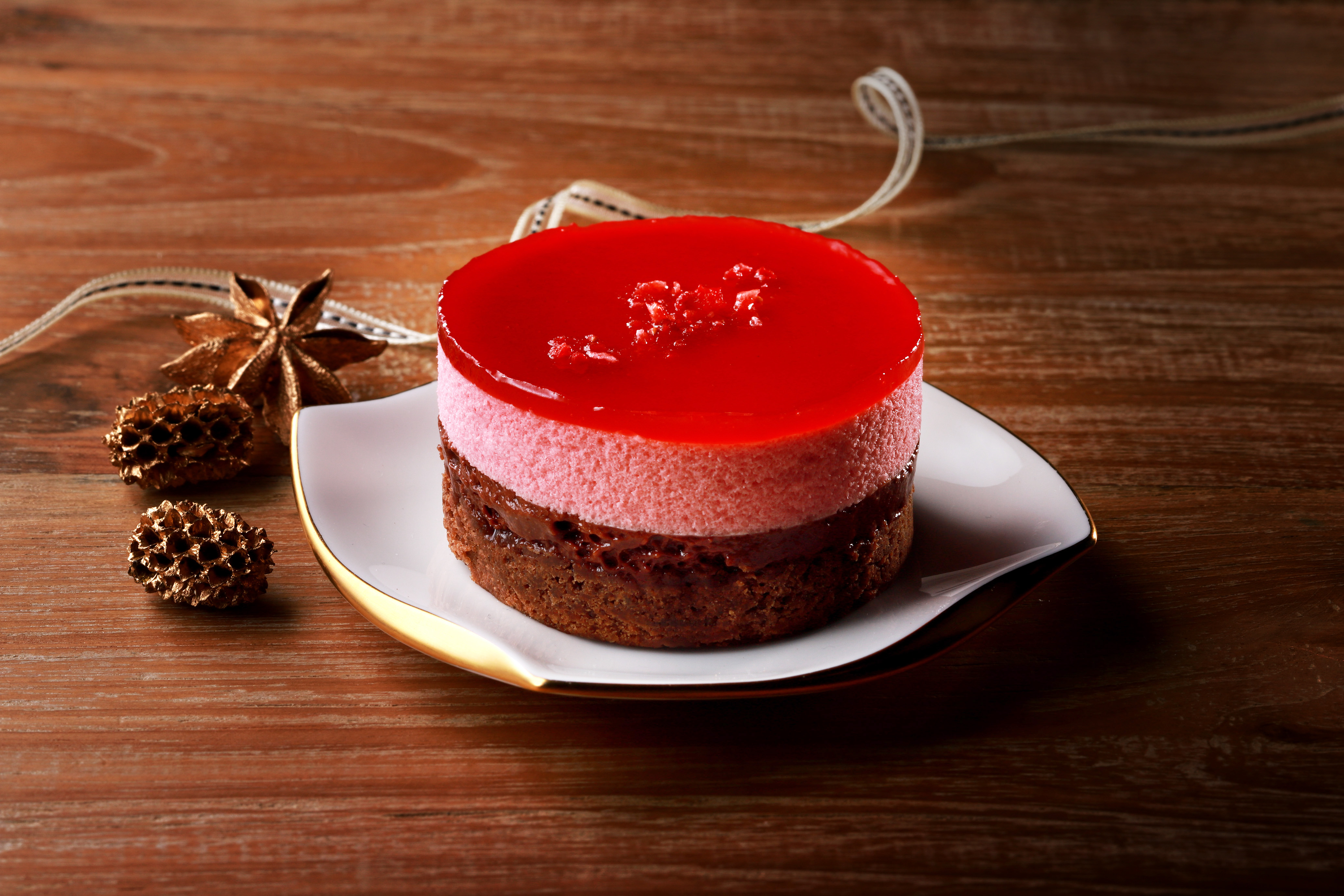 特長:ブラウニー生地に、2種類のチョコレートクリーム、フランボワーズのムースとナパージュを重ねた