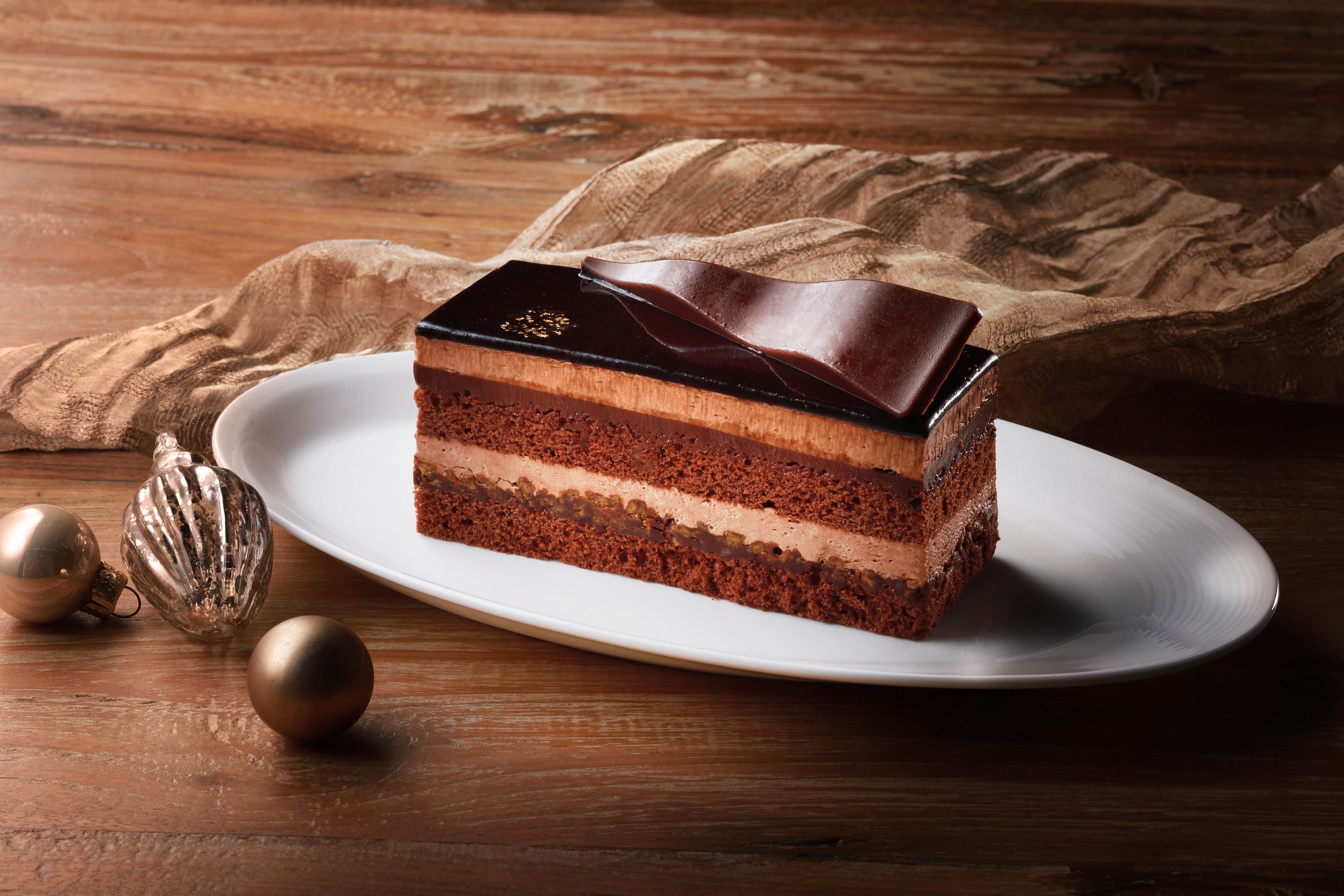 チョコクリーム、生チョコ、チョコスポンジ、チョコクッキー等を重ね様々な食感が楽しめるケーキ。