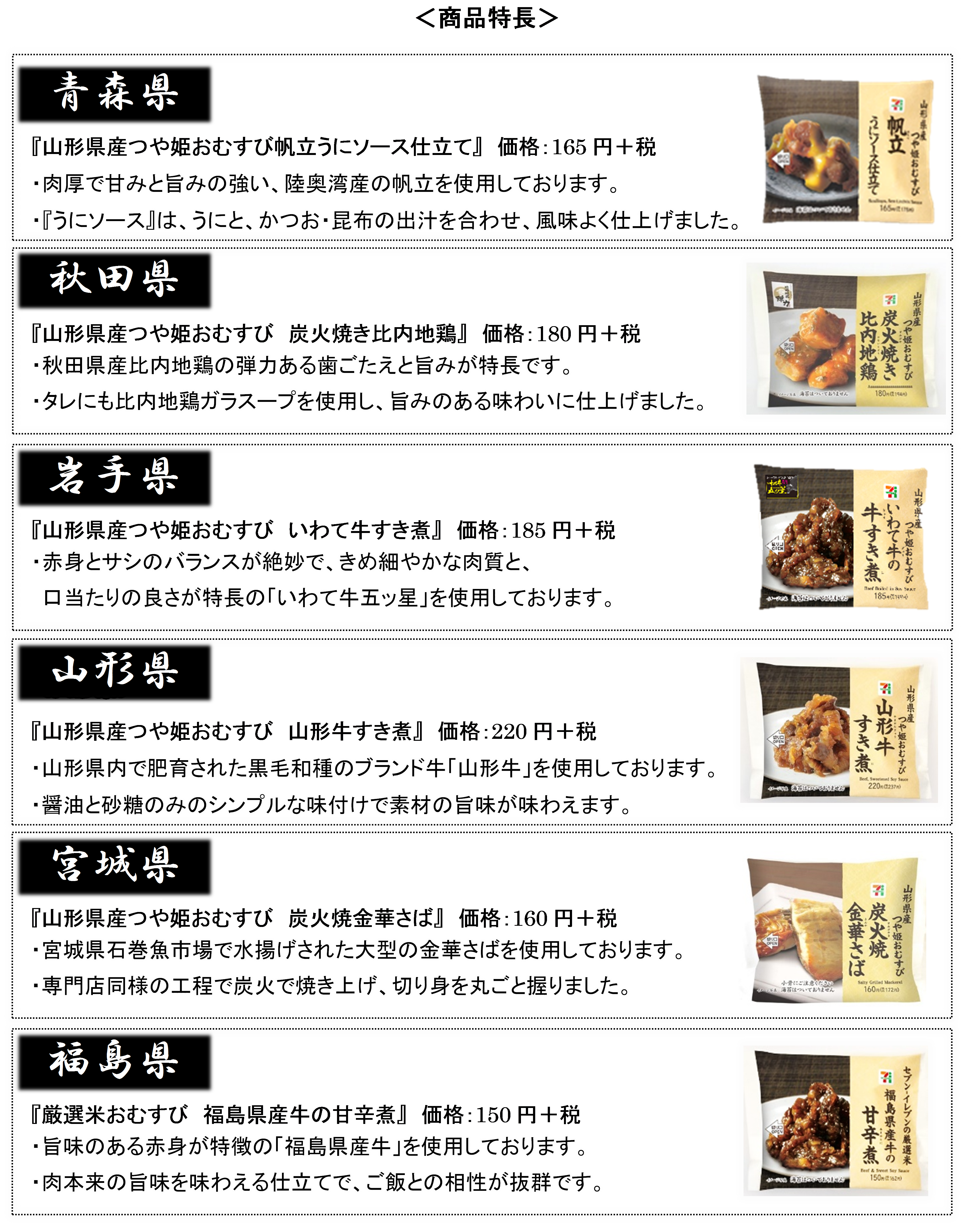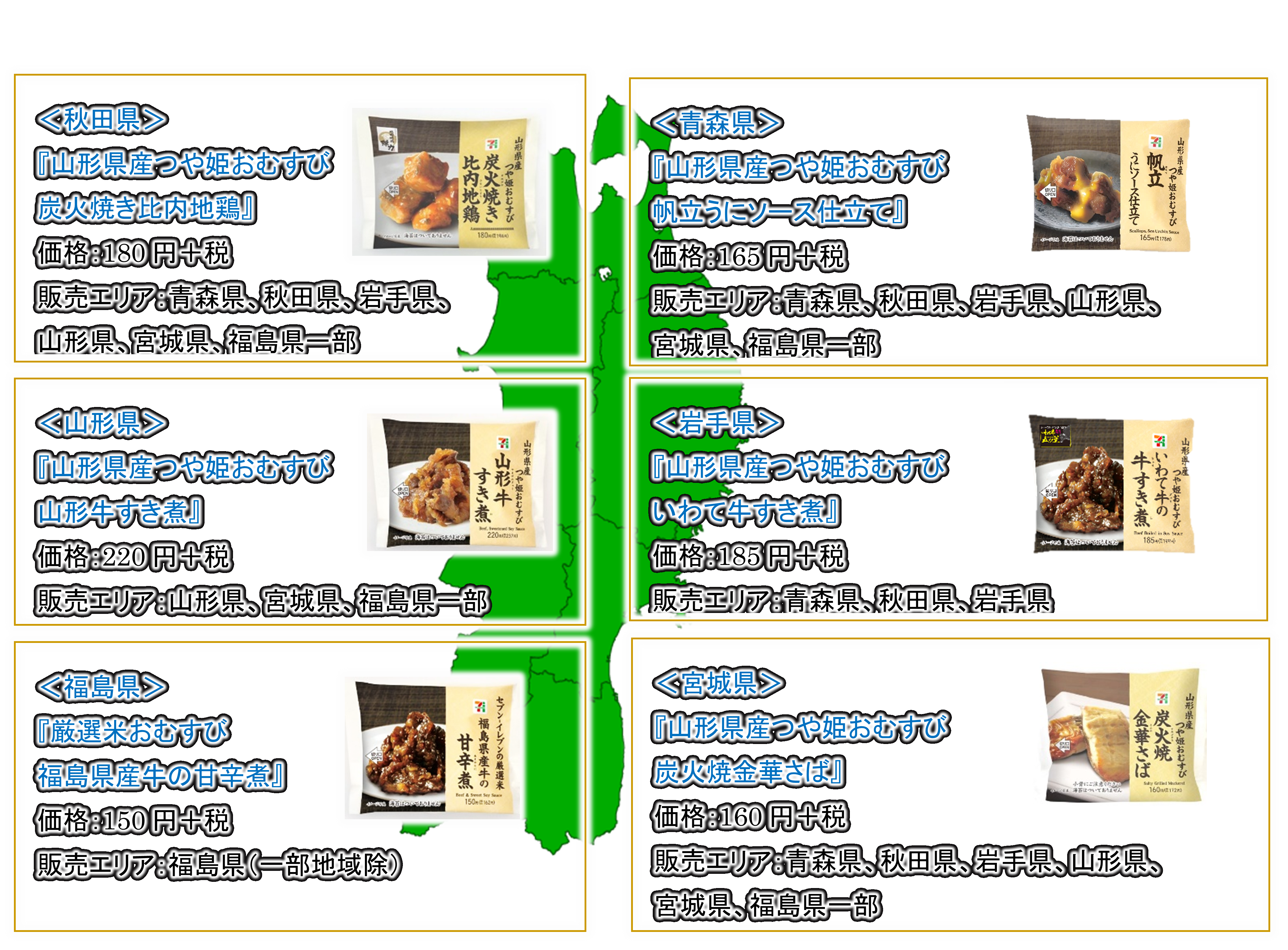 株式会社セブン‐イレブン・ジャパン(本社:東京都千代田区、代表取締役社長:永松文彦) は、地域の食を応援する取り組みの一環として、東北6県(青森県、秋田県、岩手県、山形県、宮城県、福島県)の各県産の中具を山形県が誇る良質なお米「つや姫」でふっくらと握った「つや姫おむすび」※1を12月22日(火)より順次、東北6県のセブン‐イレブン店舗1,360店(2020年11月末現在)※2にて、数量限定で発売致します。