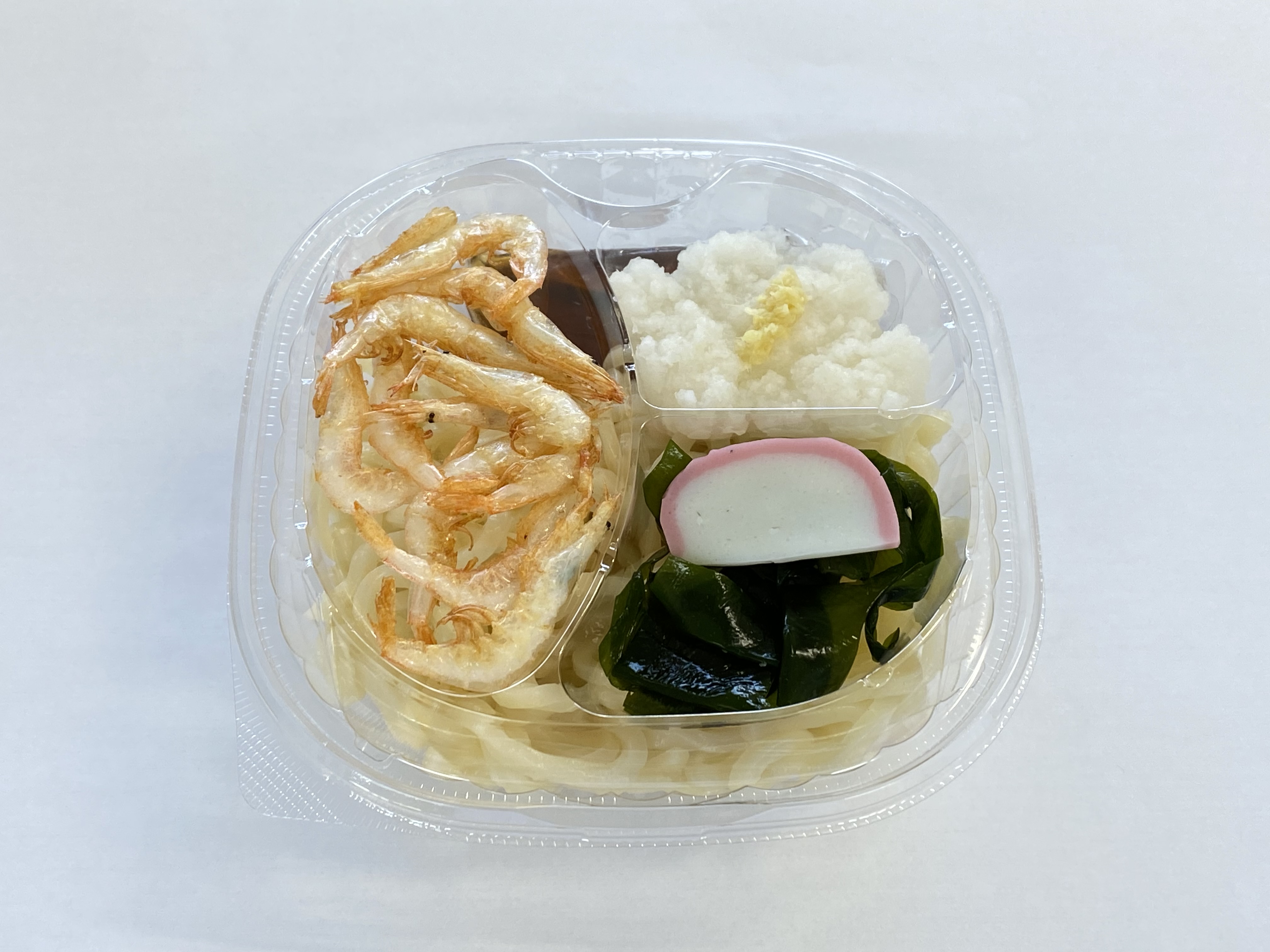 特長:素揚げにした富山湾産の白えびをたっぷりと盛り付け、のど越しの良いつるっとしたうどんに合わせました。おろし生姜を添えた大根おろしと合わせ、さっぱりと食べていただけるうどんです。
