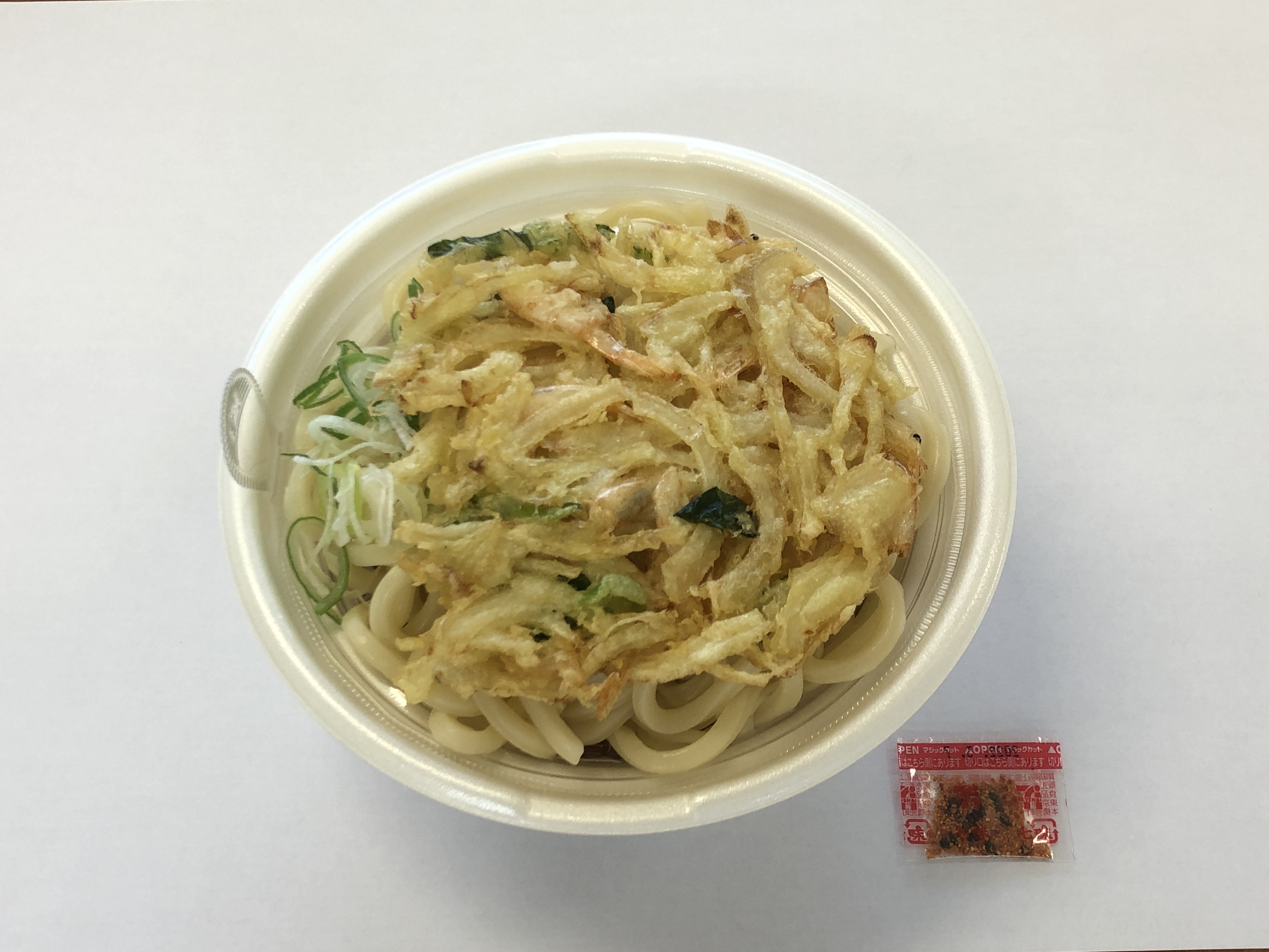 特長:富山湾産白えびと、たまねぎ等の野菜をかき揚げにした、電子レンジで温めて食べるうどんです。