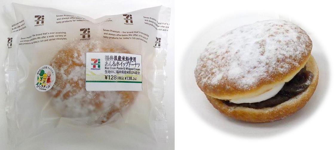 特長:福井県産の米粉を使用した、くちどけの良いドーナツです。あずきの風味と粒をしっかり感じられる粒あんとホイップクリームをはさみました。