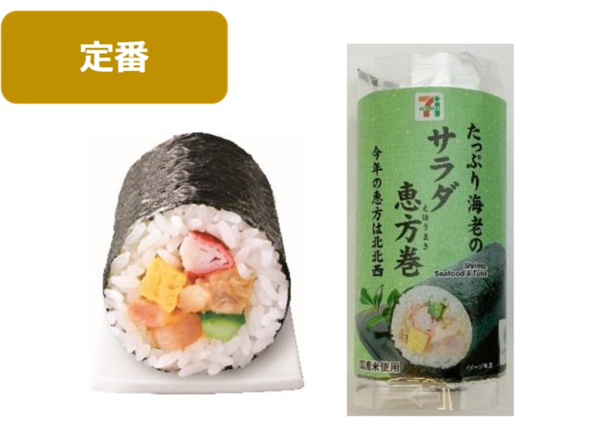 特 長:海老を焼いて風味や旨みを引き出したマヨネーズ和えやカニカマ等、幅広い世代に人気の具材を使用したサラダ恵方巻。