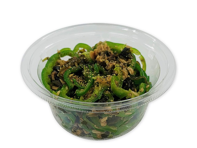 厚めにスライスしたピーマンに昆布・ツナを和えて、ごま油とブラックペッパーで味付けしました。