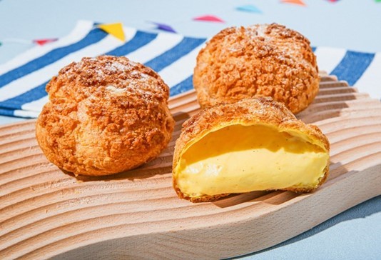 特 長:ふんわりと焼き上げたシュー生地に、こだわりの卵「エグパティシエール®」を使用した濃厚なカスタードクリームとホイップクリームを合わせました。カスタードクリームに発酵バターを使用することで、コクのあるカスタードに仕上がりました。