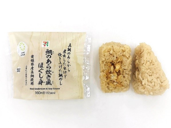 ・南予地域の愛南町の真鯛を使用。鯛のあら炊き風に仕上げた、真鯛のほぐし身入りのおむすび。