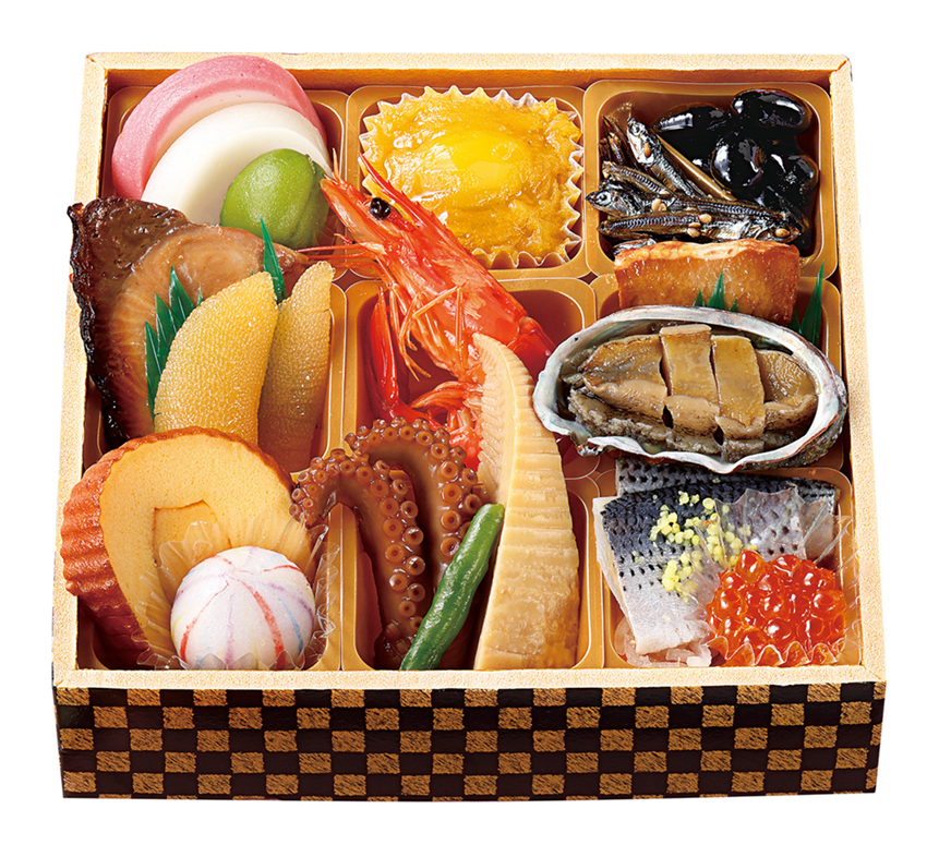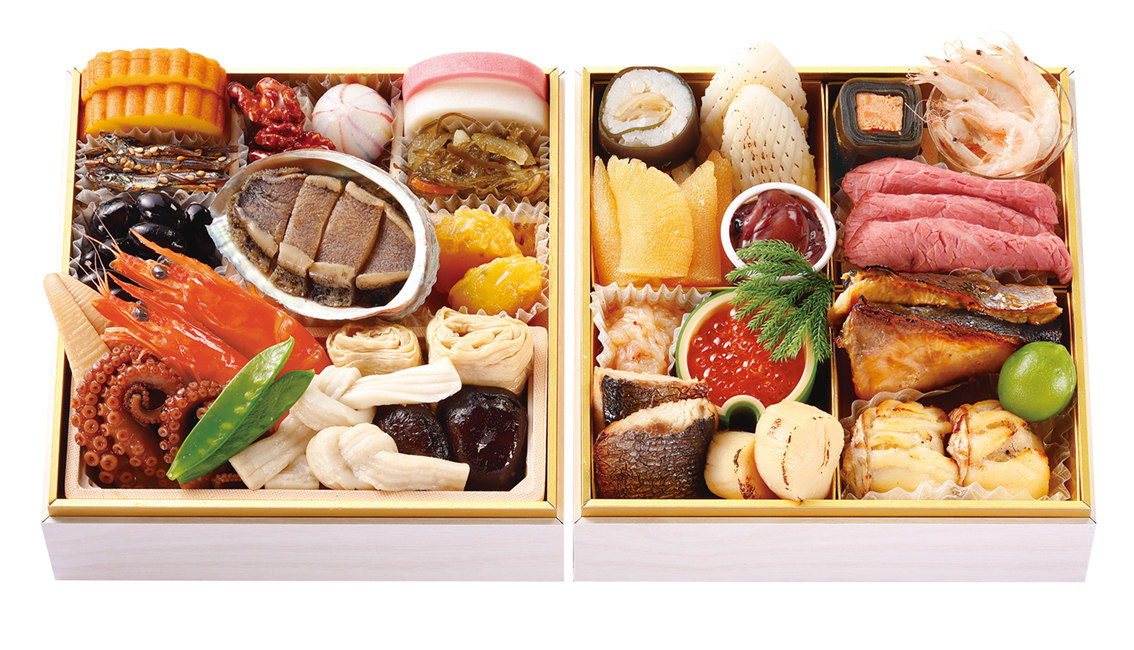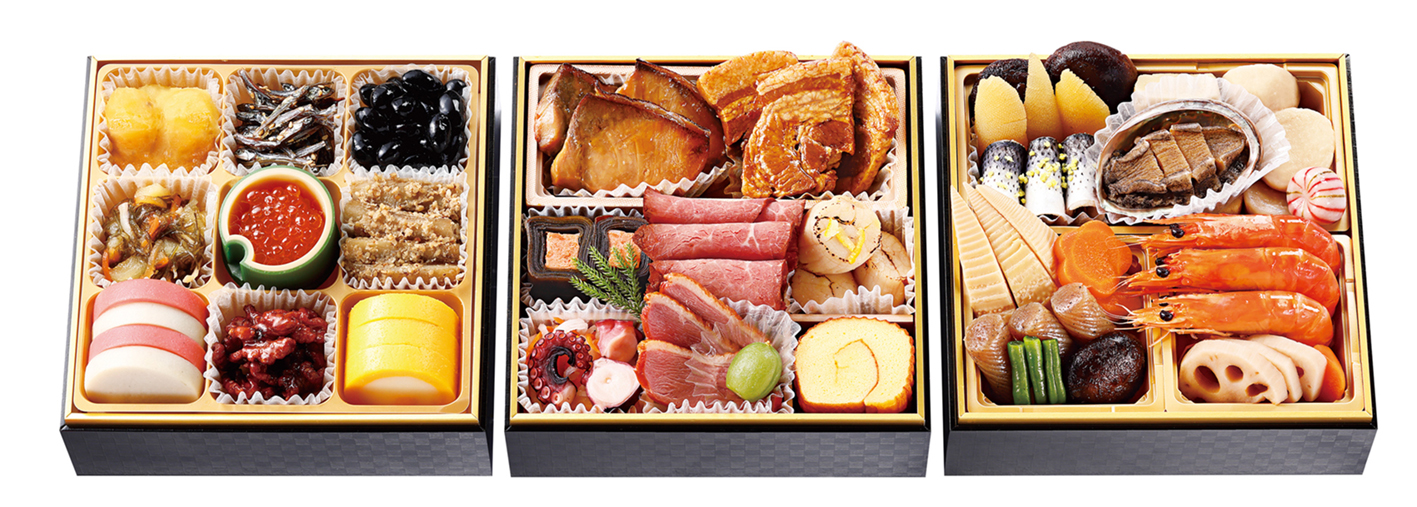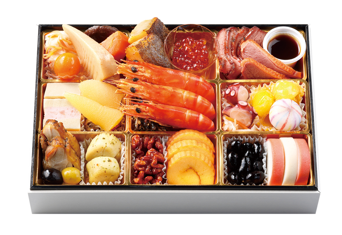 三陸産蝦夷鮑うま煮、都城和牛ローストビーフ、丹波篠山川北地区産黒豆、鹿児島県産ブリの照り焼き、北海道産数の子、真鯛の龍皮巻、栗きんとん(鹿児島県産べにはるか使用)等