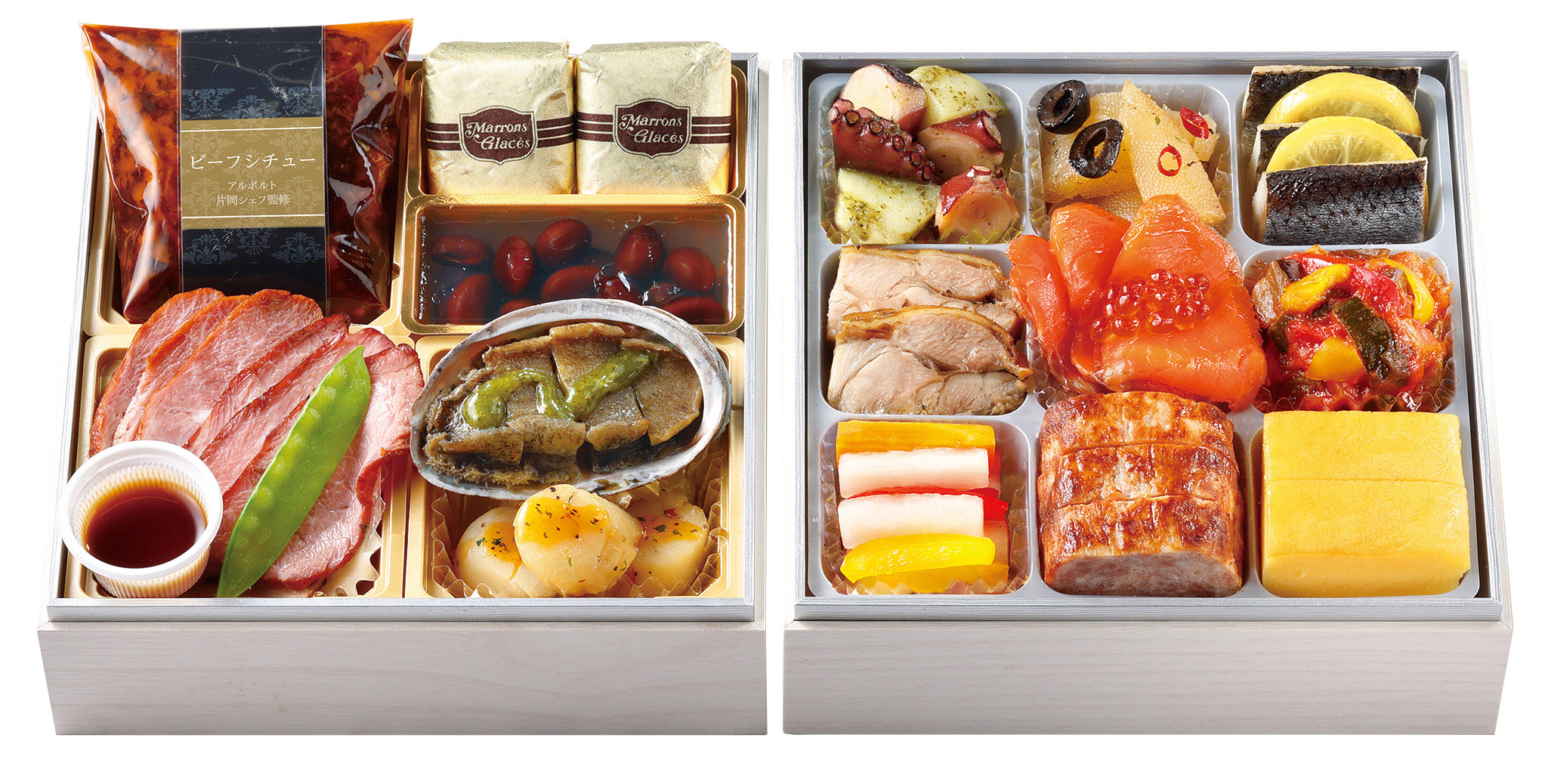 有頭海老の艶煮、鮑うま煮、豚角煮、鹿児島県産ブリの照り焼き、丹波篠山産黒豆、紅白蒲鉾、国産いくら醤油漬け、数の子、栗きんとん(安納芋使用)、伊達巻、若桃の甘露煮等