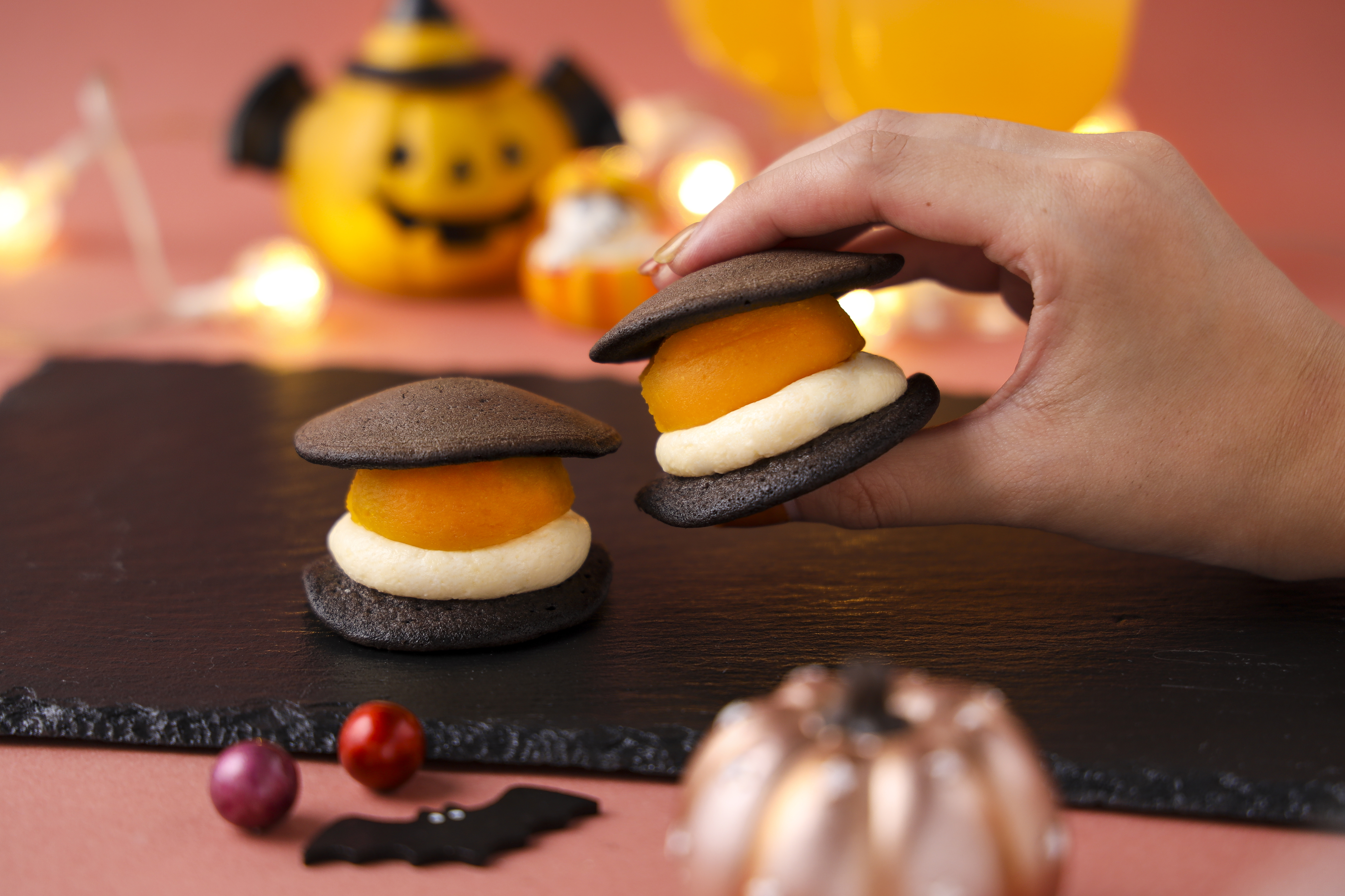 ◆特 長: ココア風味の小さなどら焼き生地で、バタークリームとかぼちゃ餡を挟みました。濃厚なかぼちゃの味わいをお楽しみいただけます。