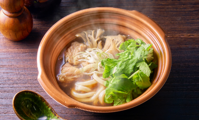 ・鶏の自然な旨みと風味が感じられるスープに、鶏肉やきのこ、うどんを合わせました。