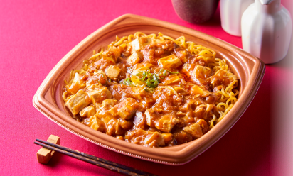 ・従来よりもより香ばしく仕上げた揚げ焼きの麺に、刻んだ椎茸や筍等を加えたマーボー餡が絡む、食感の良い焼そばです。