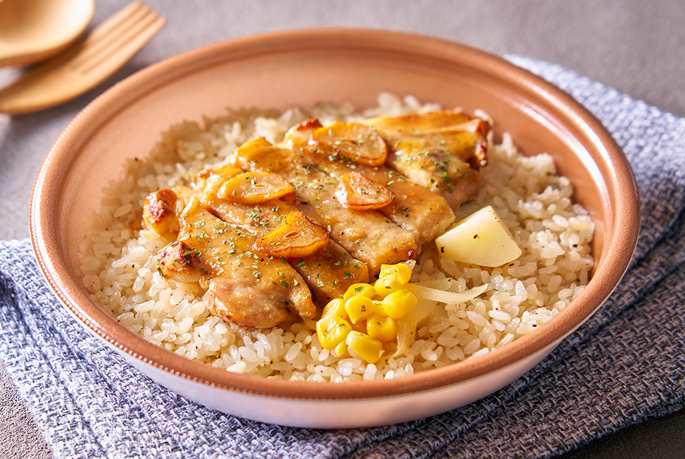 ・1食分ずつ丁寧に焼き上げたトンテキを、香ばしく炒めたペッパーライスに盛りつけました。