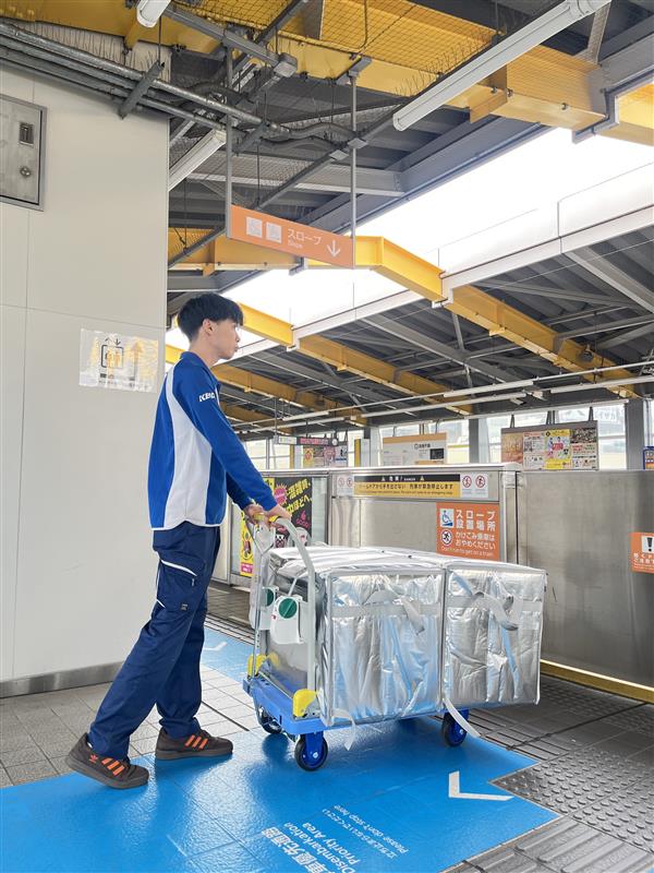 配送方法:京王運輸の配送員が高幡不動駅で商品を積み込み、沿線の駅構内にセブン‐イレブン店舗が出店する5駅(多摩センター駅・立川南駅・立川北駅・玉川上水駅・上北台駅)で降車し6店に納品。