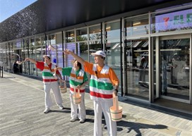 ▲暑い日も少しでも快適に大阪・関西万博を楽しんでいただくために、期間限定で「打ち水」の実施や、「オリジナルうちわ」や「塩キャンディ」を配布しています。