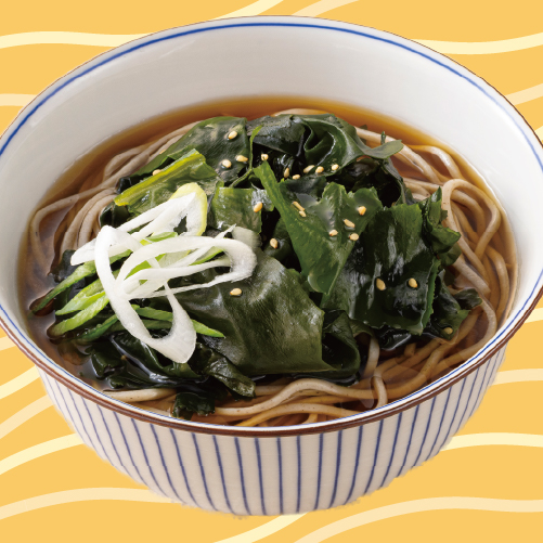 わかめの胡麻和えとねぎを盛り付けた、わかめそば。