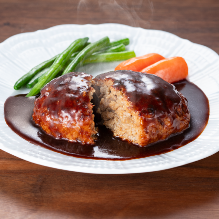 牛肉・豚肉それぞれの旨味が溢れるジューシーなハンバーグです。ハンバーグの肉汁がデミグラスソースと絡むことで、ソースの深い味わいが引き立ちます。