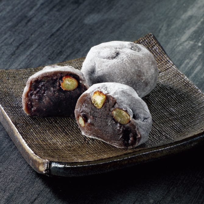 赤えんどう豆を混ぜ込んだ黒いもち生地で、ごまあんを包んだミニ大福。やさしい甘さと香ばしい風味が特長です。
