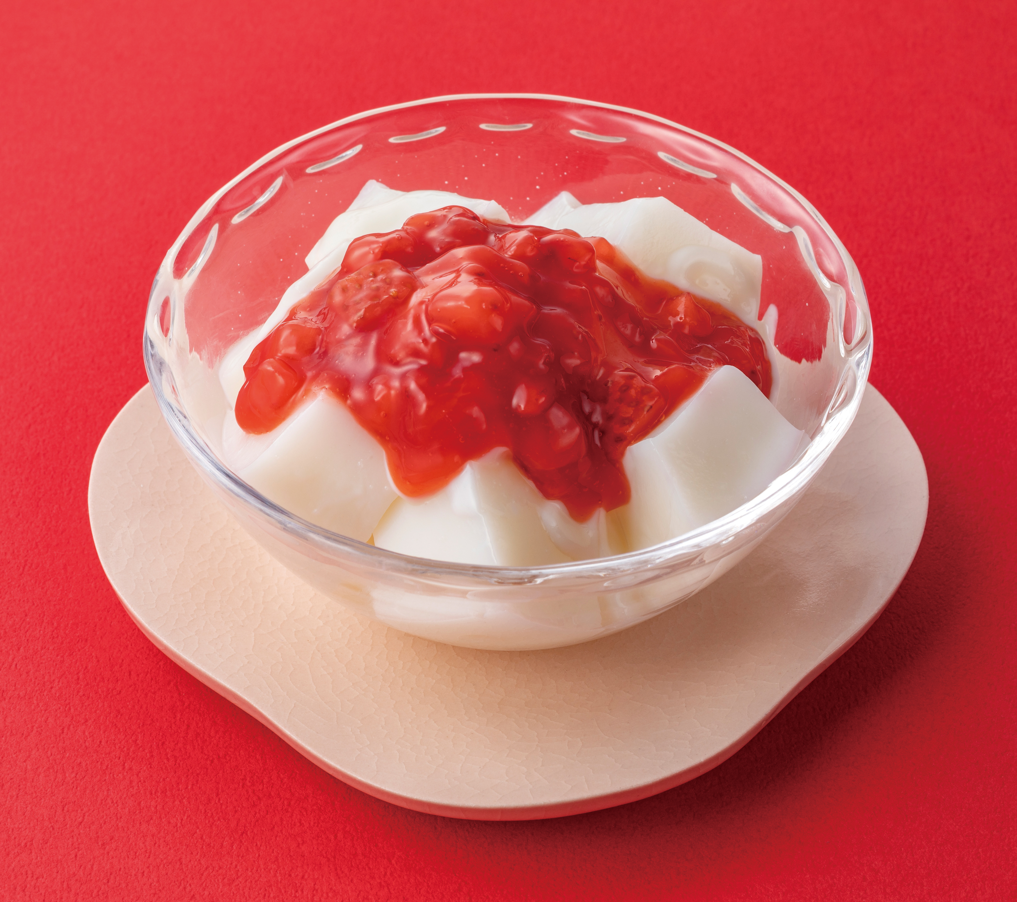 ■もっちりみるくわらび いちご 価格:250円(税込270円) 発売日:1月11日(日)~順次 販売エリア:沖縄県除く全国 牛乳と練乳を使用したもっちり食感のみるくわらびもちに、果肉入りの甘酸っぱいいちごソースと練乳ソースをかけた商品です。