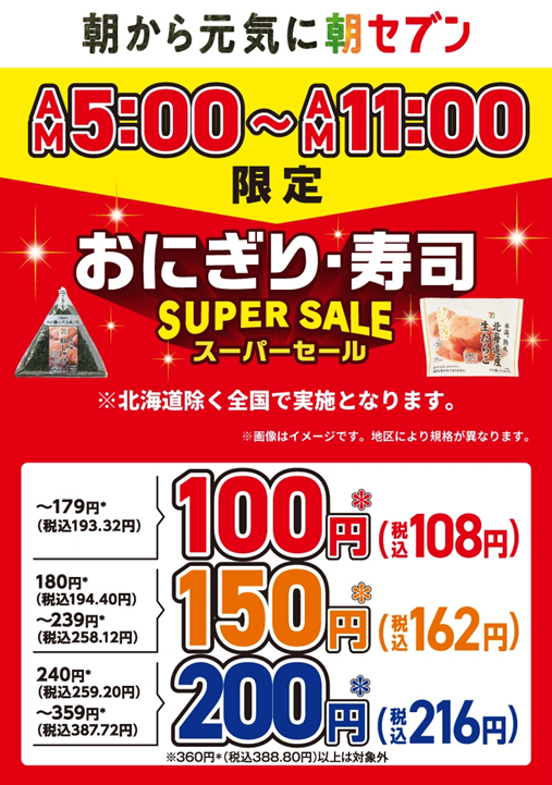 「朝セブン」のスタートに合わせ、お客様によりおトクにおにぎり・寿司を楽しんでいただけるよう、下記の期間で朝限定のセールを開催します。ぜひご活用ください!
